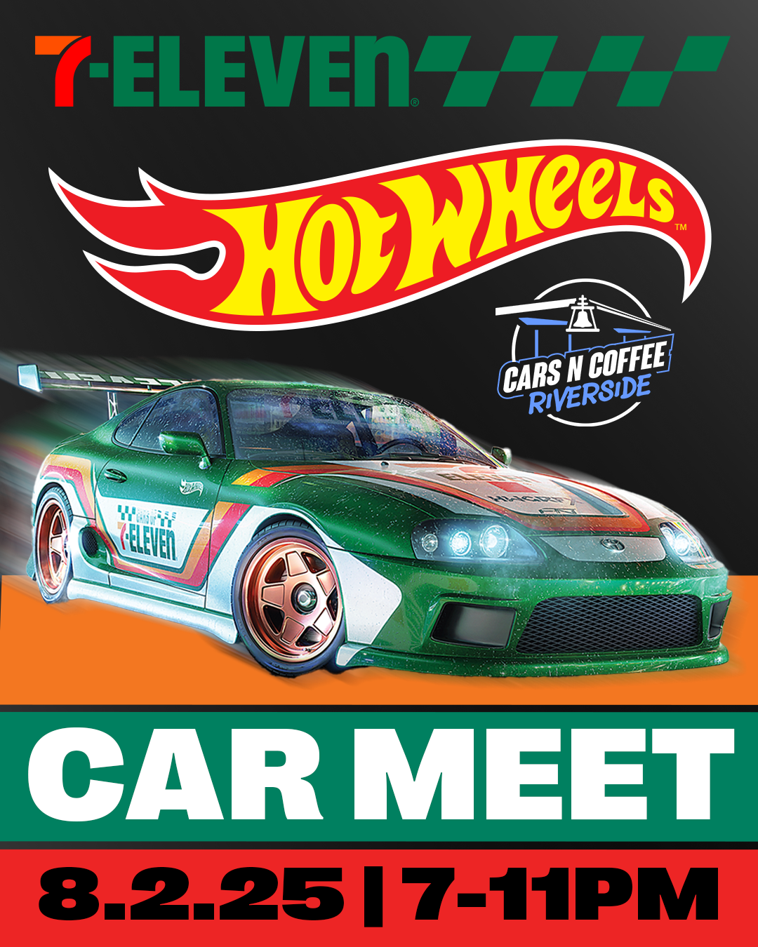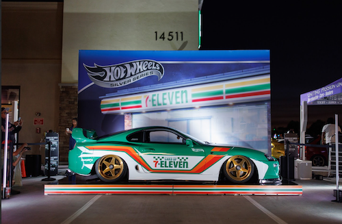 We hosted the first official 7‑ELEVEn car meet, a full day event created with and for the community that had championed this partnership from the beginning. The activation included a life-sized wrapped Supra, a full 7‑ELEVEn x Hot Wheels merchandise collection sold on 7Collection, and the first Hot Wheels track ever constructed inside a 7‑Eleven store, designed and built in partnership with Mattel. The meet brought together an estimated three thousand attendees to the 7-Eleven parking lot and featured two hundred cars curated through our partnership with Cars N Coffee Riverside.
