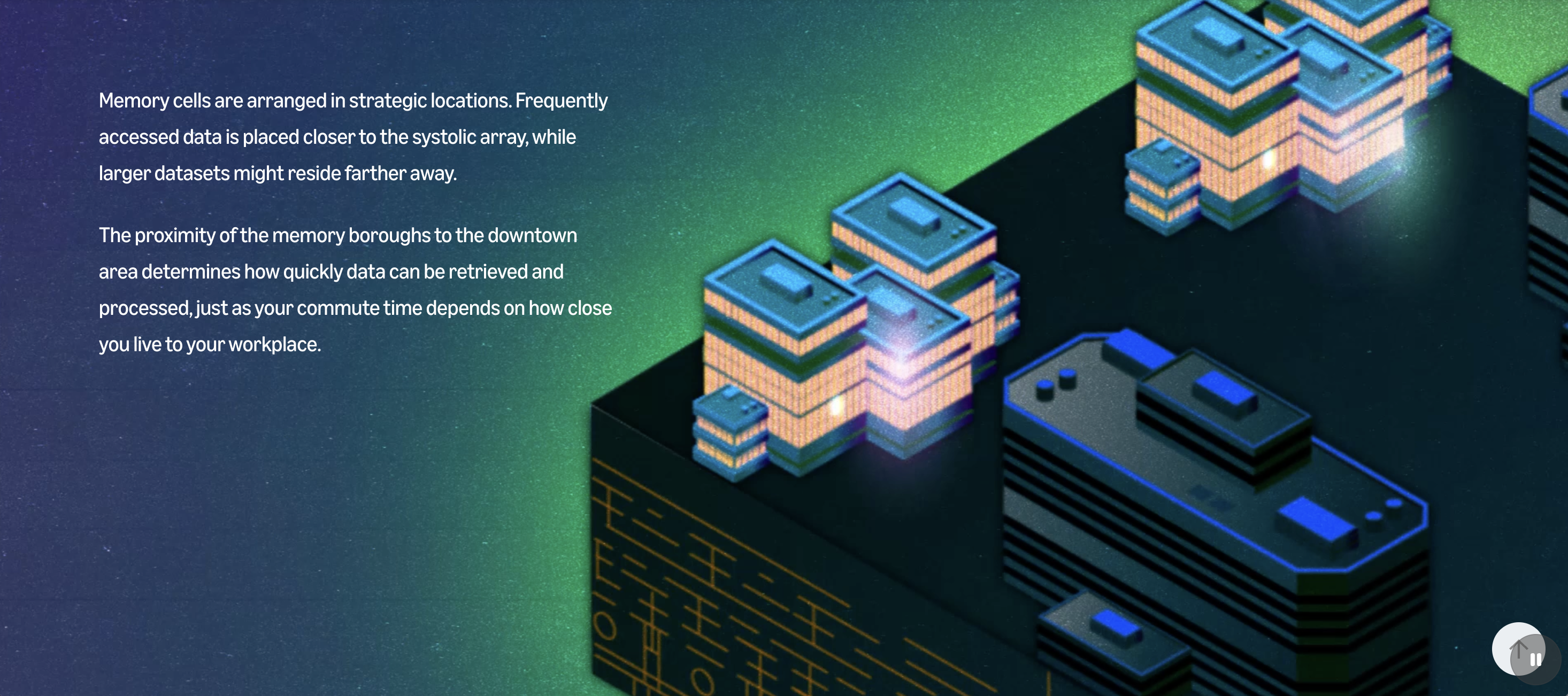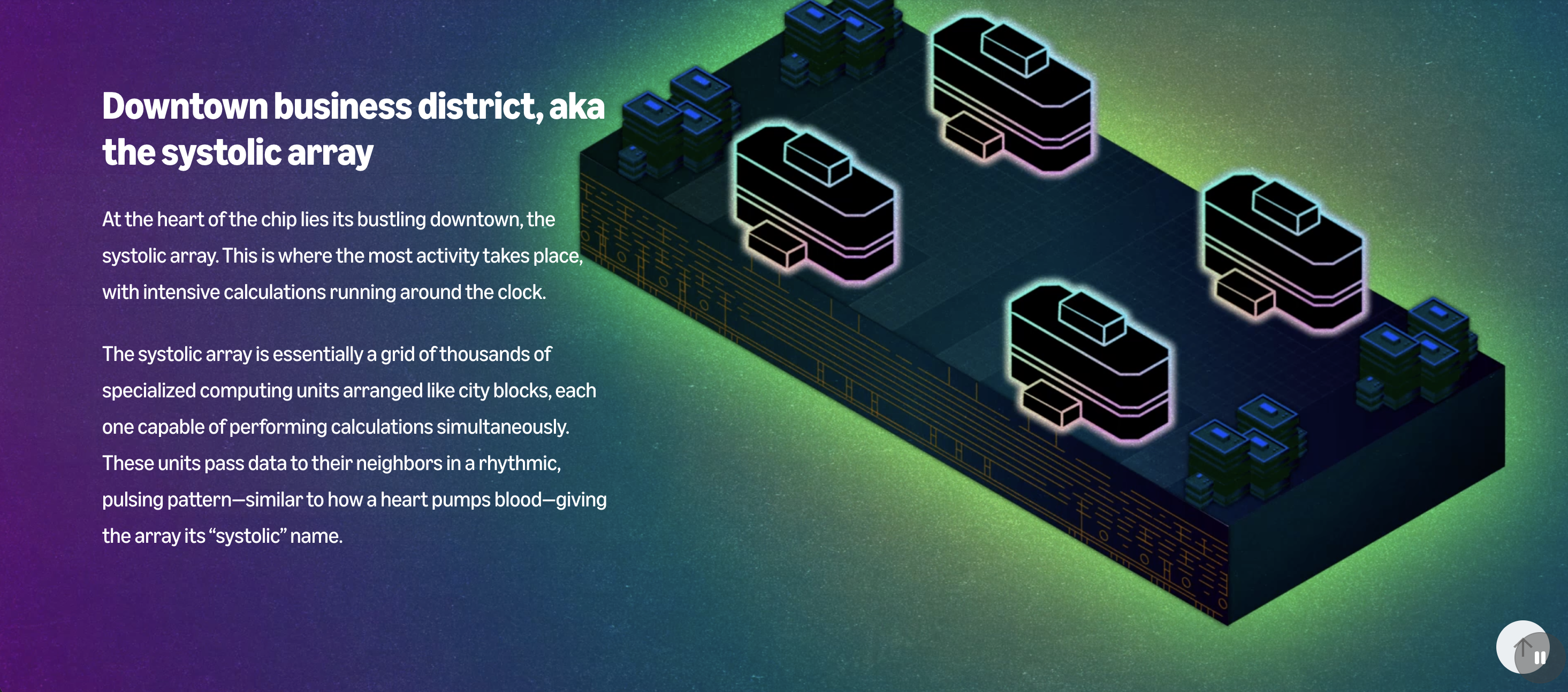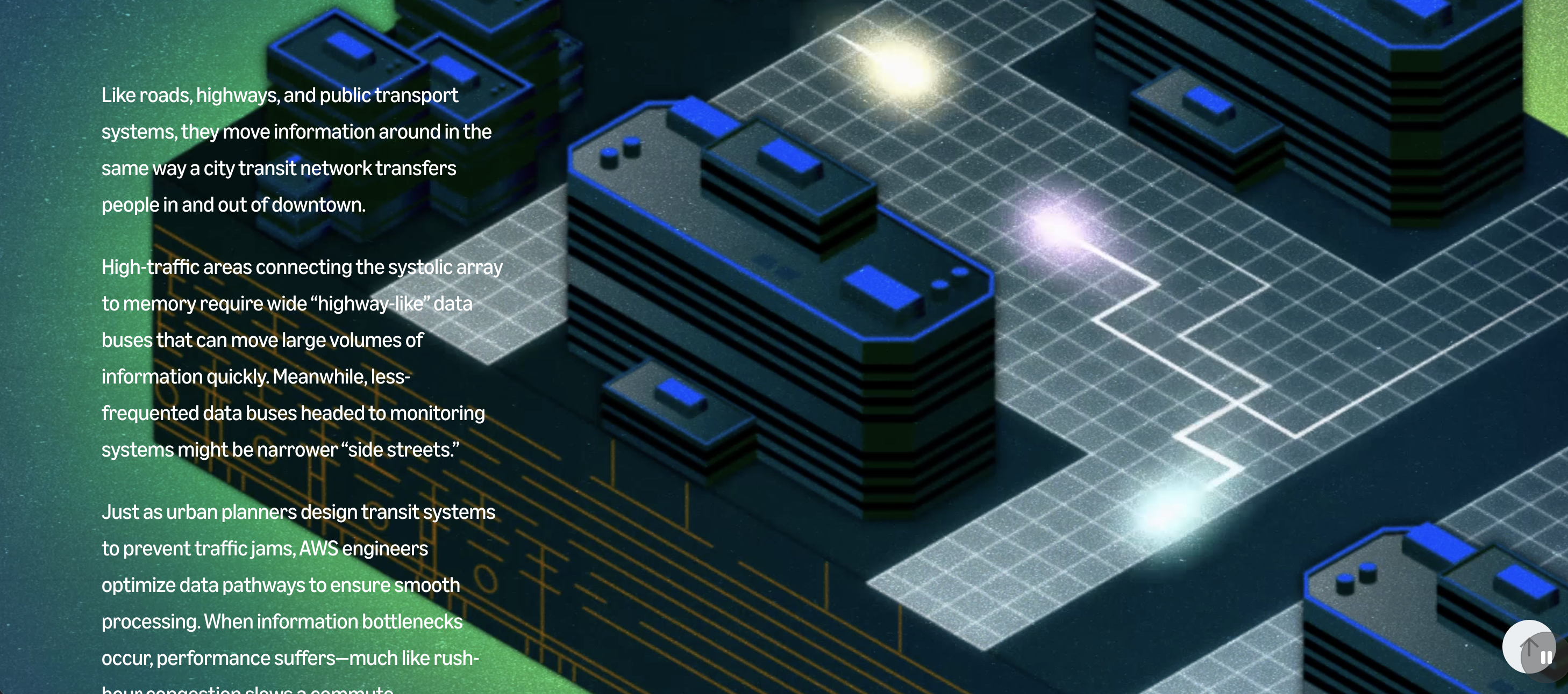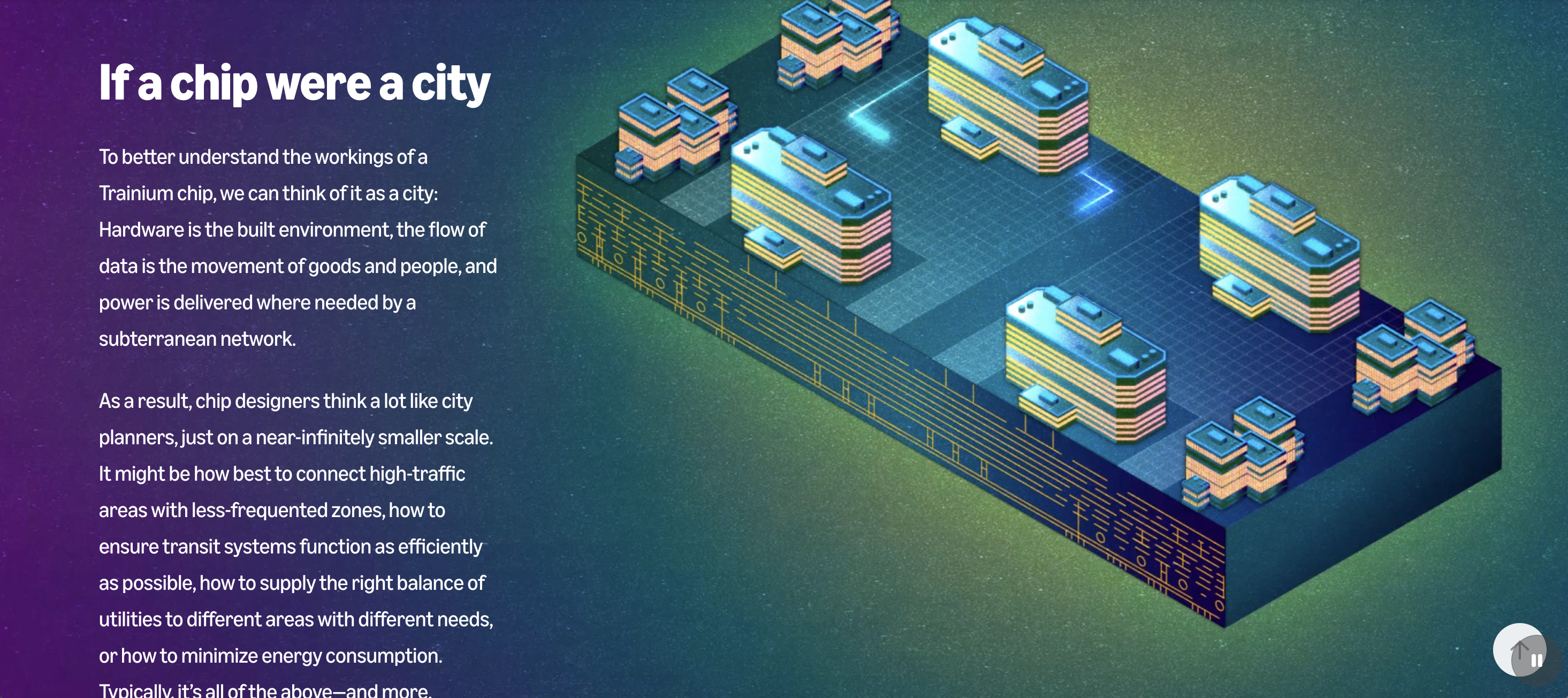 Initially, we struggled translating tech into compelling visuals. An engineer’s note that his architect mother compared chip design to blueprints sparked our initial concept, a Zillow-like 3D home tour of a chip, but we saw the metaphor's limitations. Shifting to "chip as city" clicked immediately: transistors became buildings, data pathways became streets. This gave readers an intuitive framework for understanding chip architecture.