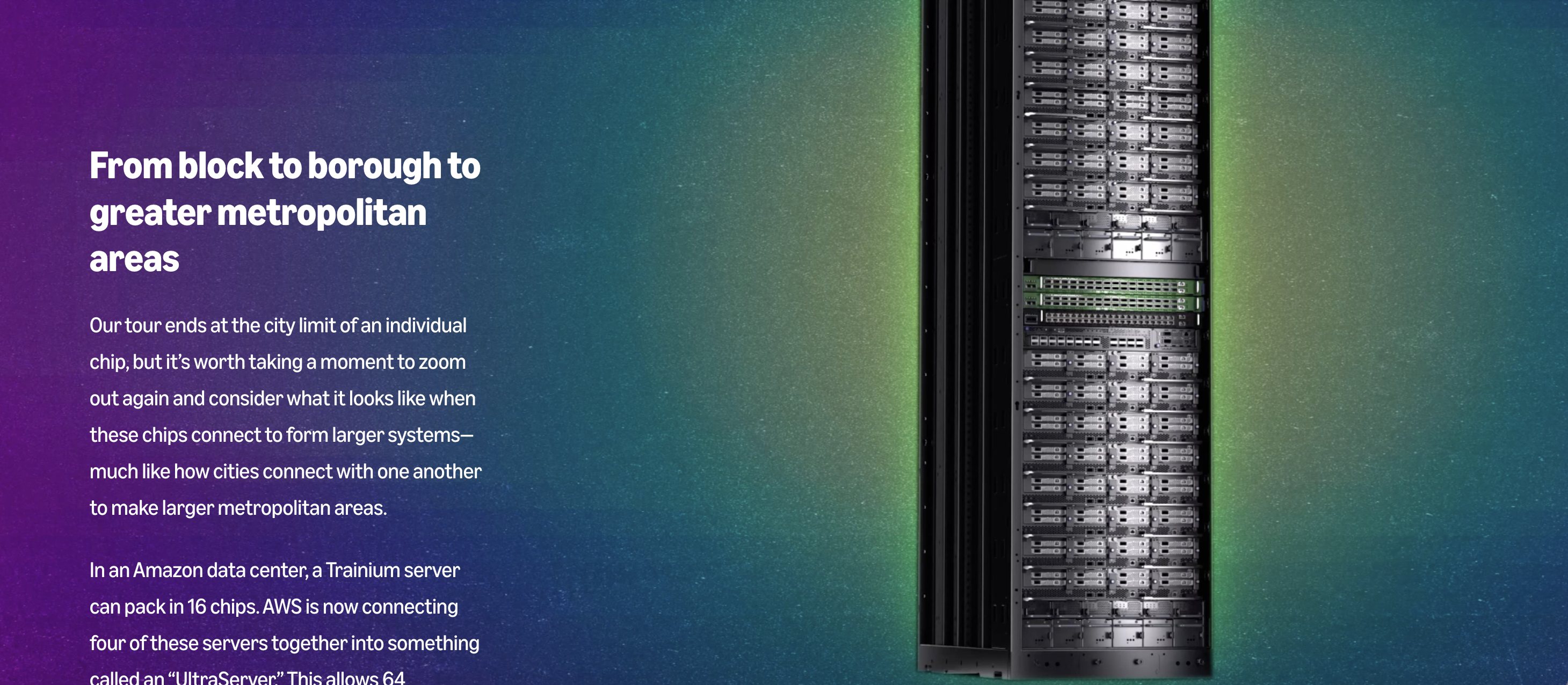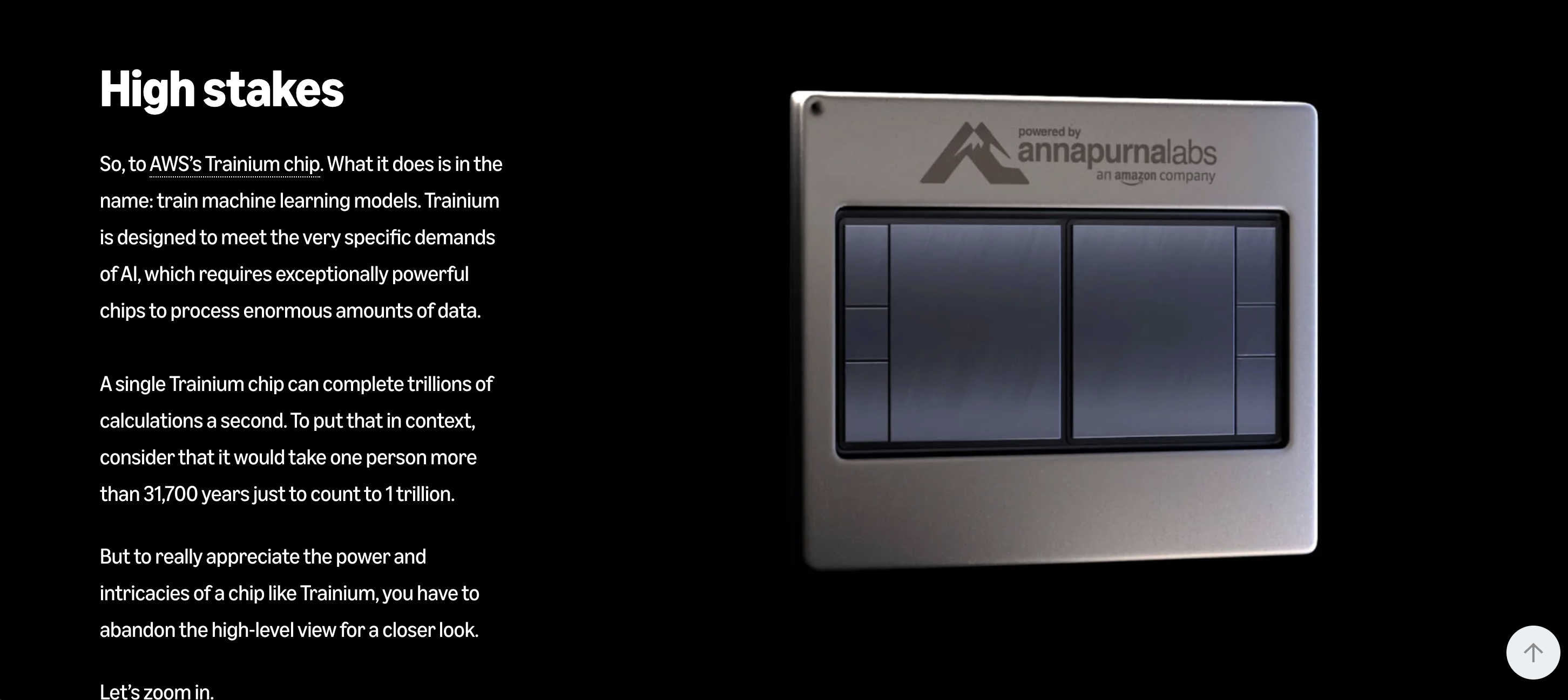 The narrative presented a challenge: giving readers enough context to appreciate the chip tour (the climax) without losing momentum. We tested brief and extensive introductions, landing in the middle. Balancing education with brand messaging required similar experimentation. We landed on one striking comparison: "A single Trainium chip can complete trillions of calculations a second. To put that in context, it would take one person more than 31,700 years just to count to 1 trillion."