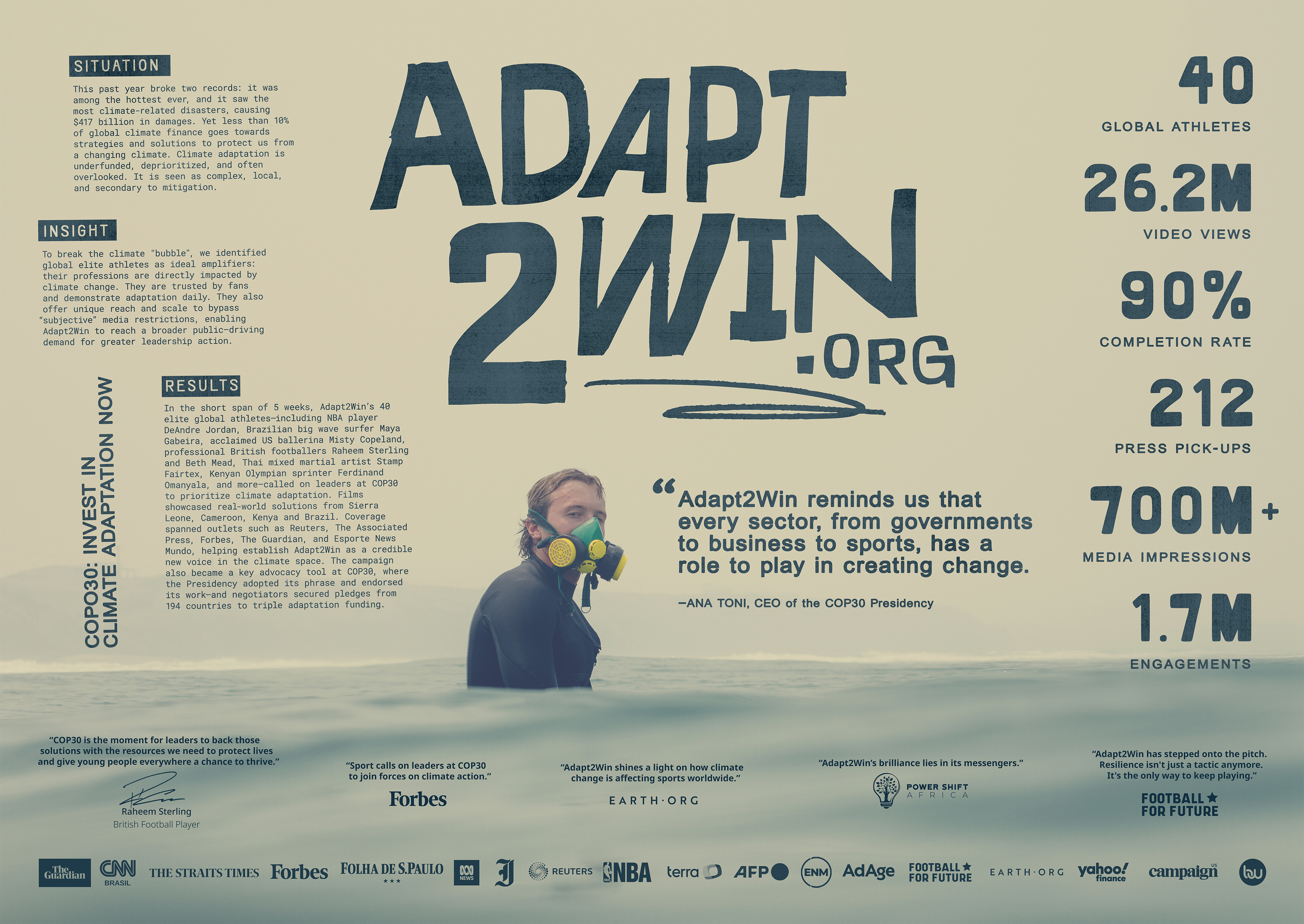 A modest 5-week paid media flight targeted global policy makers and leaders who would be present at COP30. A double page spread ran in The Economist in the lead-up to COP30 signed by Adapt2Win athletes and the campaign highlighted innovative, real-world solutions from communities across Sierra Leone, Cameroon, Kenya, and Brazil, illustrating how investment in adaptation can protect lives, strengthen economies, and secure a sustainable future for all.