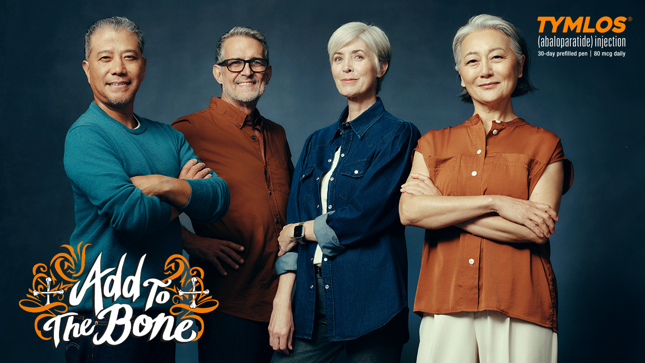 Add to the Bone is a rallying cry for patients who refuse to be intimidated by the “fear of fracture” mentality. This is a campaign that’s standing up for those unwilling to stick to the status quo and hell-bent on tackling osteoporosis on their own terms: powerful, undaunted, and ready to fight back by actively rebuilding bone with TYMLOS.