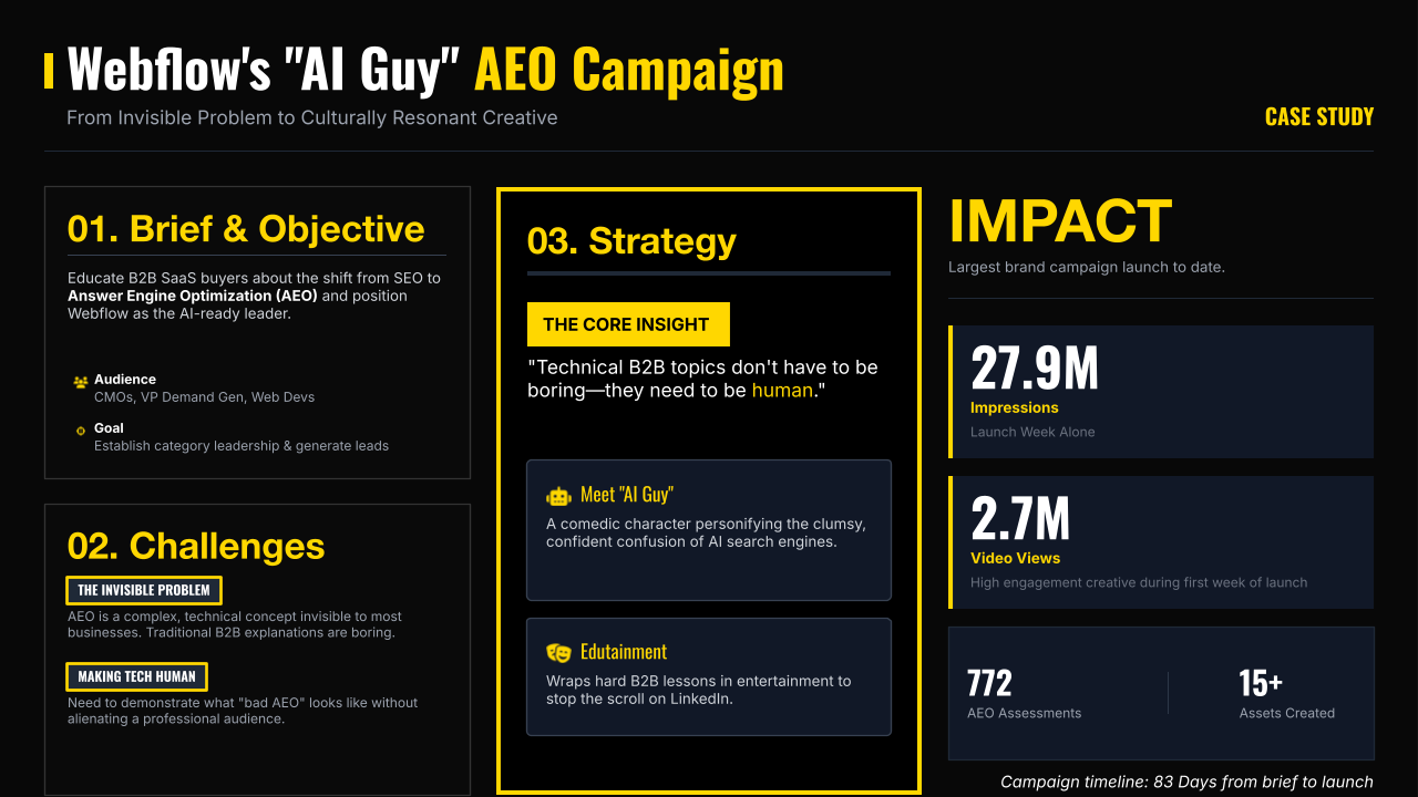 The objective of the AI Guy campaign was to reframe how marketers think about AI-driven discoverability by making the problem immediate, human, and relatable. As search behavior shifts toward AI-generated answers, many brands face a growing risk of invisibility. The campaign aimed to name that fear, spark recognition, and clearly position Webflow as the platform that helps brands stay discoverable and in control of their story in an AI-first world. Success was defined not only by reach, but by engagement, conversation, and meaningful product interaction tied directly to AEO and AI-SEO.