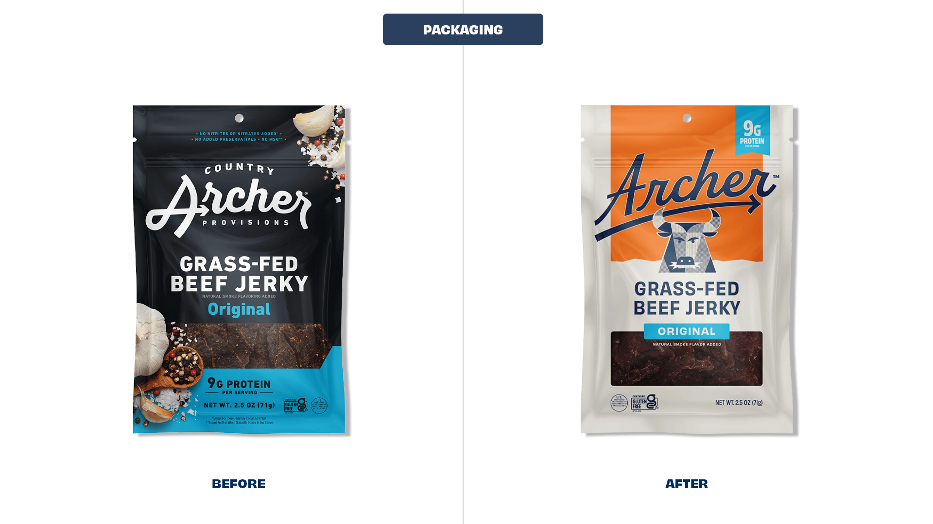We started by addressing the brand name, Country Archer. Dropping “country” signaled a meaningful evolution that helped distance the brand from the noisy heritage jerky space as well as embrace a more premium identity. The streamlined name, Archer, feels intentional and contemporary while retaining brand equity.