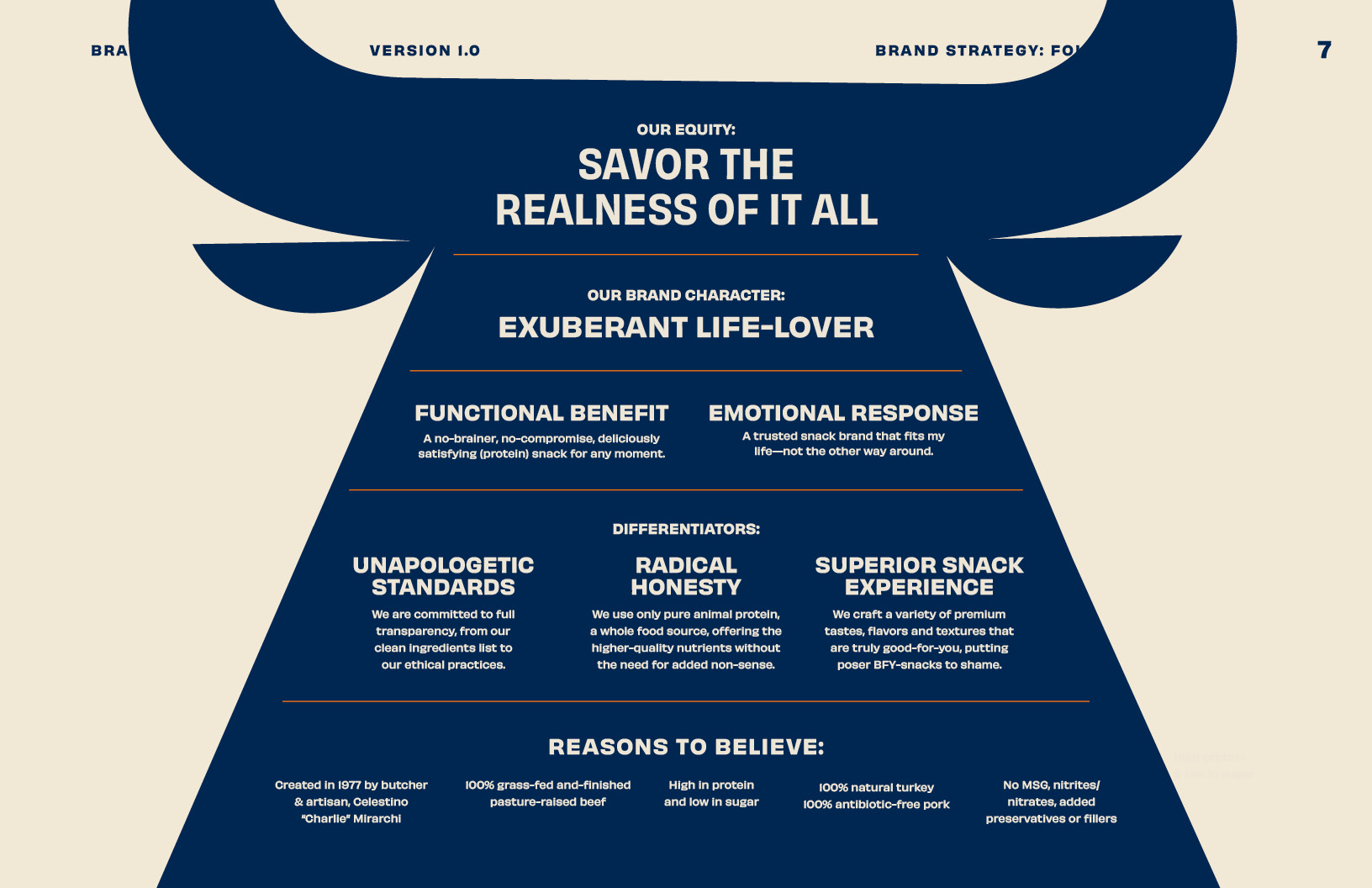 Our two core audiences, “health hackers” and “gourmet foodies,” seek nutritious, quality snacks and elevated flavor profiles; however, the legacy jerky landscape did not fully meet their expectations (or their standards). To align with a more sophisticated consumer, Archer needed to clearly telegraph its core differentiators: radical honesty, unapologetic standards, bold ideas, and enthusiastic expertise. This began by treating “real” as a holistic belief system, not just a claim.