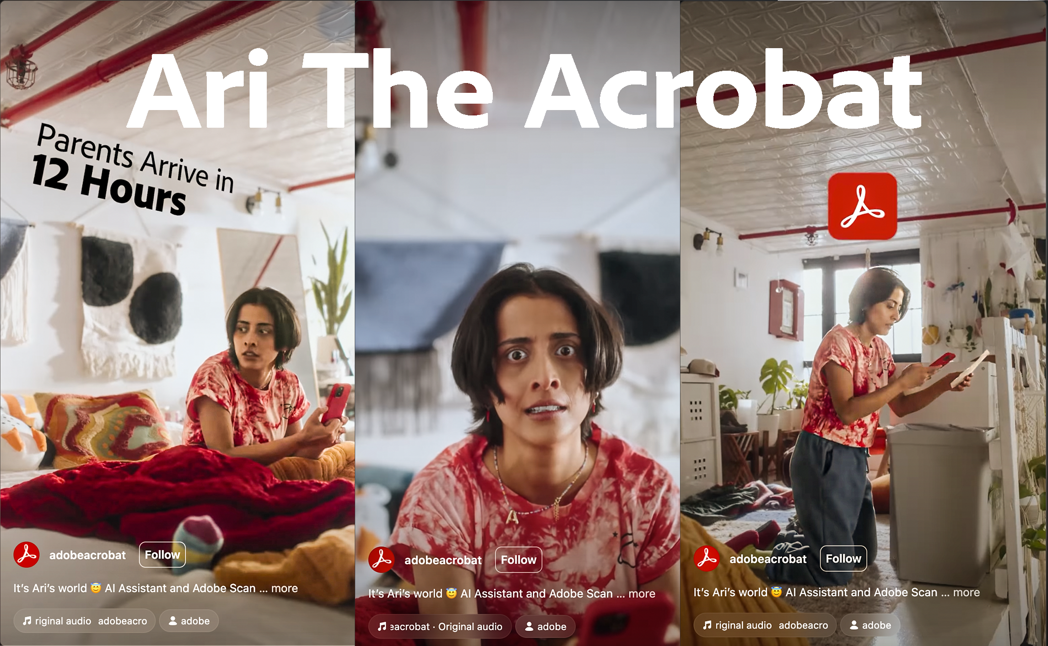 Instead of relying on feature demos or corporate messaging, the campaign introduced Ari, a recurring social character navigating everyday professional and personal moments - contracts, confidence, awkward situations, early mornings, and cultural disconnects. Through Ari’s story, Acrobat’s AI and productivity features became a supporting character, quietly helping Ari stay on track.