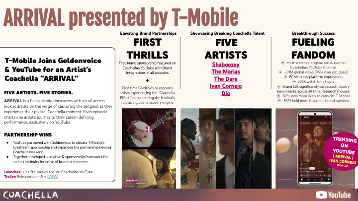 ARRIVAL also marked Coachella’s first collaboration with a brand on its YouTube channel. T-Mobile’s integration was designed to feel authentic to both the artists and fans, with consistent branding at key moments, a presenting title sponsorship, and subtle magenta cues in graphics, lighting, and set design. A custom Fan Connect moment wove real voice messages recorded by fans on site directly into all episodes, creating a more personal and meaningful connection.
