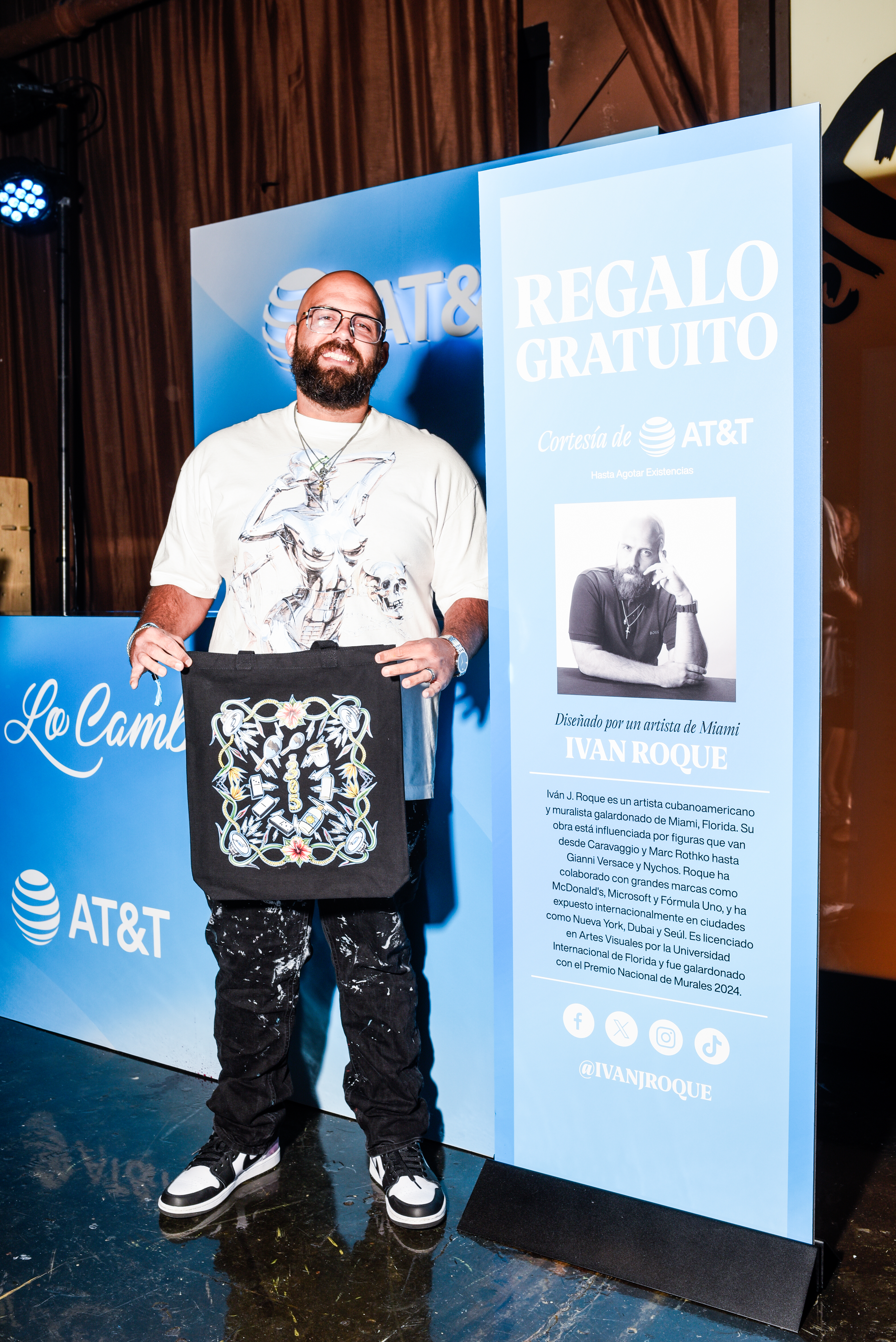 Once inside, to authentically reflect Miami’s cultural identity, AT&T partnered with local Cuban-American muralist Ivan Roque to design a custom AT&T tote inspired by the city’s heritage. The limited-edition totes were distributed to attendees and were fully claimed within the first hour of doors opening—demonstrating strong demand and resonance. The activation also featured an AT&T-branded display where Roque interacted with guests and shared the inspiration behind his artwork, adding a personal and community-driven dimension to the experience. Ivan Roque was so excited about this partnership with AT&T that he even posted on his own socials, generating additional reach with his fans and followers.