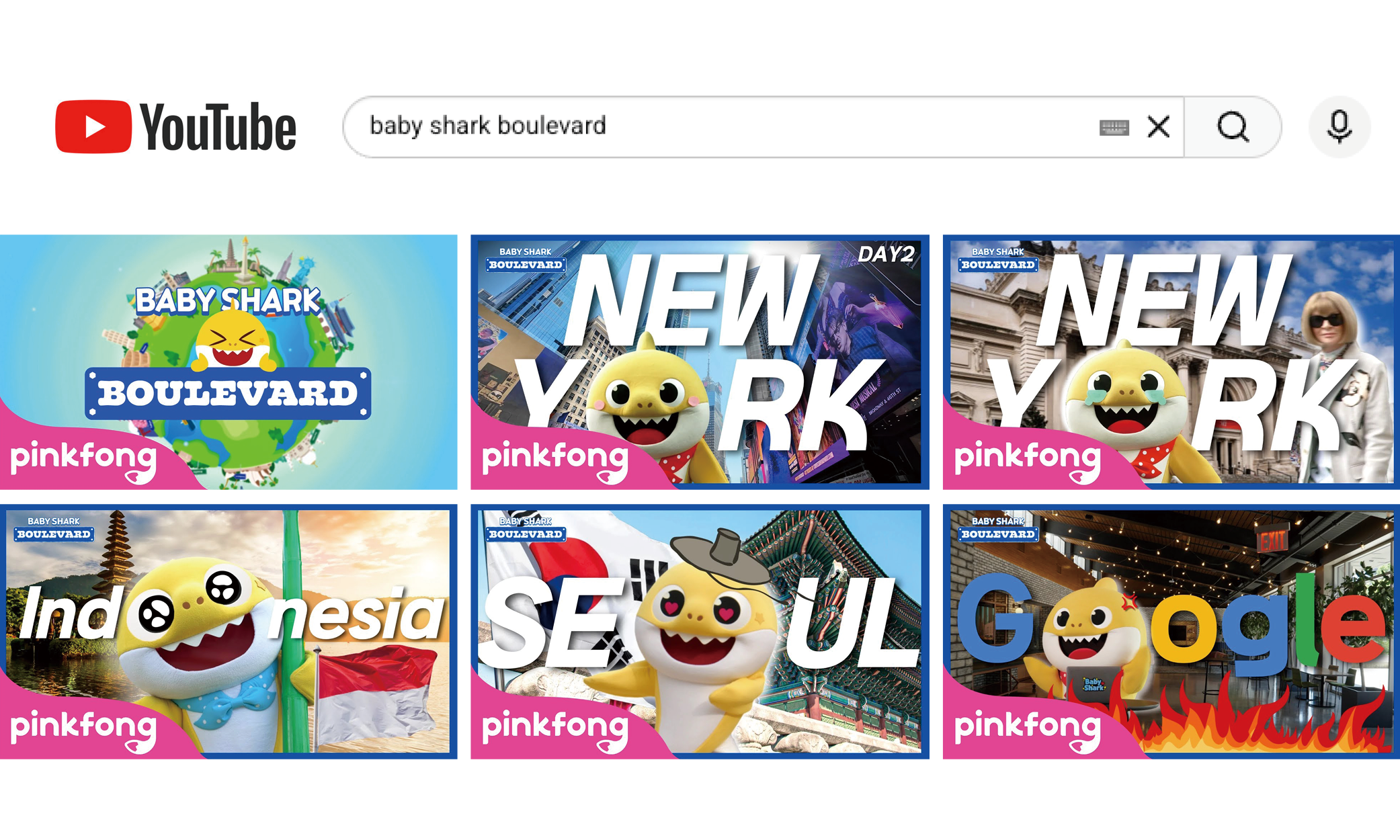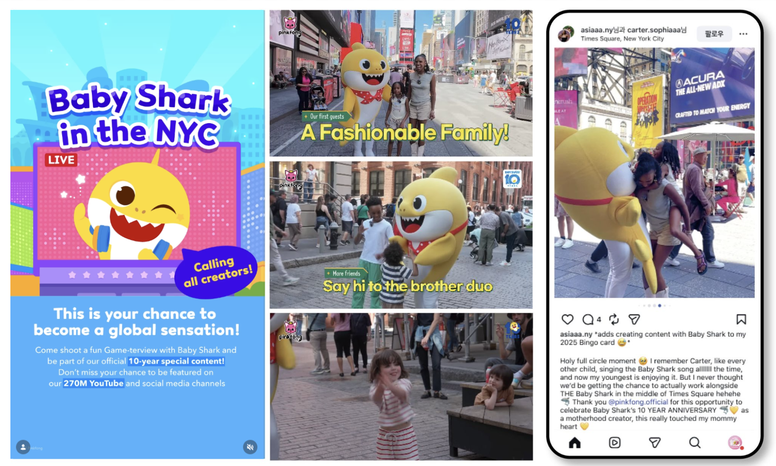 We worked with local partners such as Google, NYC Ferry in the US, Pakuwon Mall, and Ancol Beach in Indonesia, and Suwon FC in Korea, and featured a broad range of participants, including teenagers who grew up watching Baby Shark, parents sharing it with their young children, and Indonesian mega kid influencers Majaya (4.15M subscribers) and Leika (18.4M subscribers), surprise appearances at Suwon FC soccer matches in Korea, and interviews with managers at the Google’s NYC headquarter who witnessed Baby Shark’s global rise firsthand.