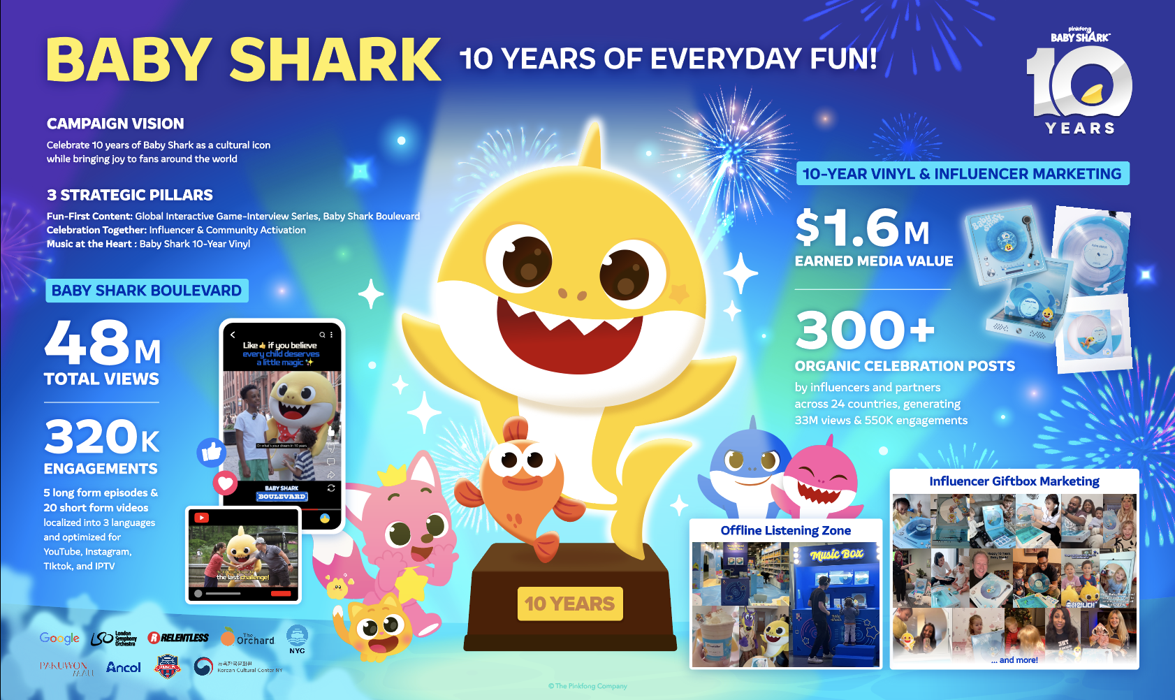 Ultimately, our goal was not only to commemorate the milestone but also to reaffirm Baby Shark as a globally beloved brand that will continue to bring audiences of all ages together to sing, play, and celebrate, delivering everyday fun to audiences around the world for the next decade.