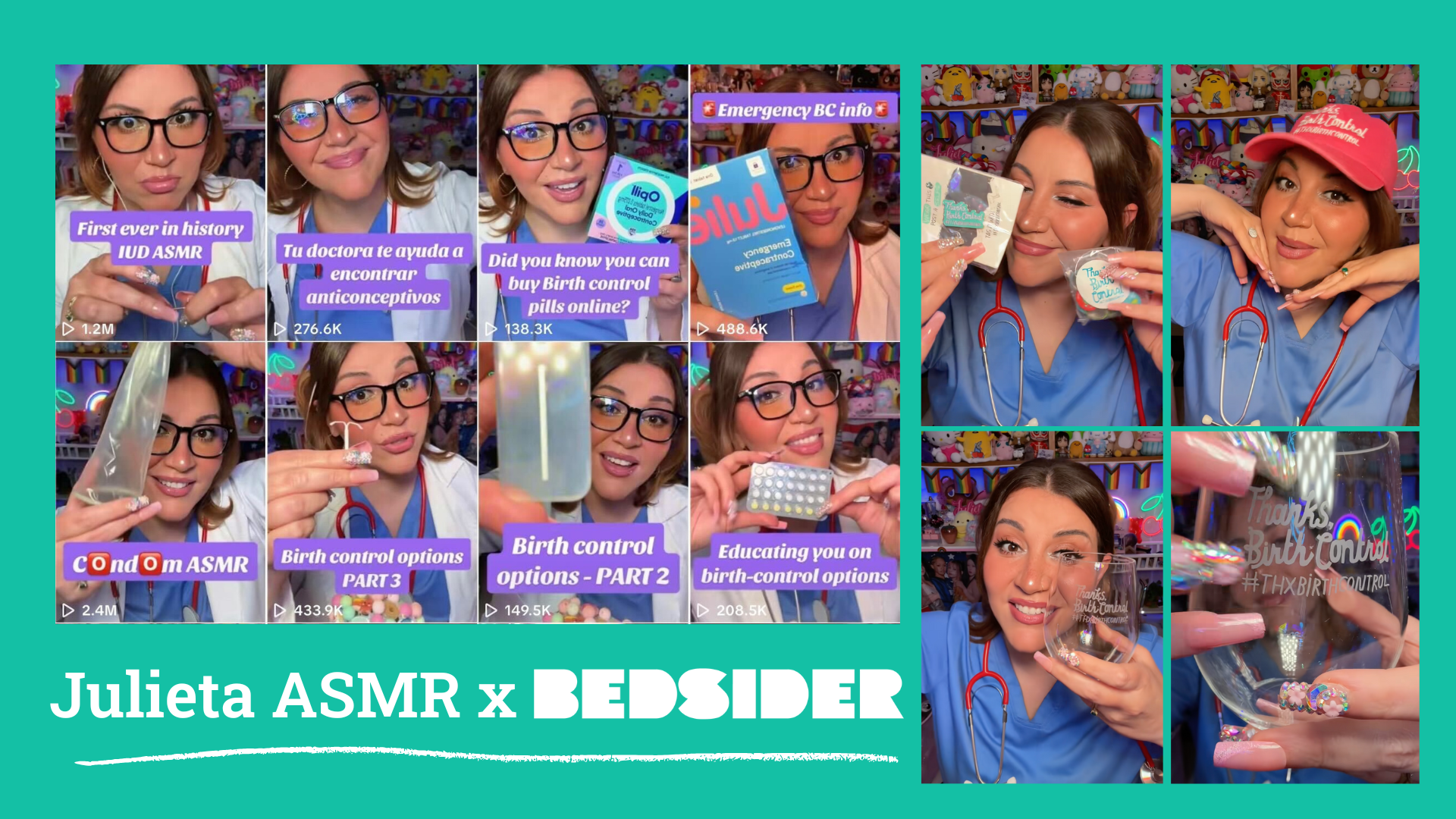 What began as a single planned video quickly grew into a full series. Julieta was so energized by the concept and props we shared that she created nine ASMR videos in her signature doctor-style role-play and compiled them into a playlist. She introduced her audience to Bedsider as a trusted source and shared approachable, high-level information about several birth control methods, including one video entirely in Spanish. Her calming, reassuring style helped the series stand out in a space where sexual health content is often hard to find, hard to trust, or overly clinical.