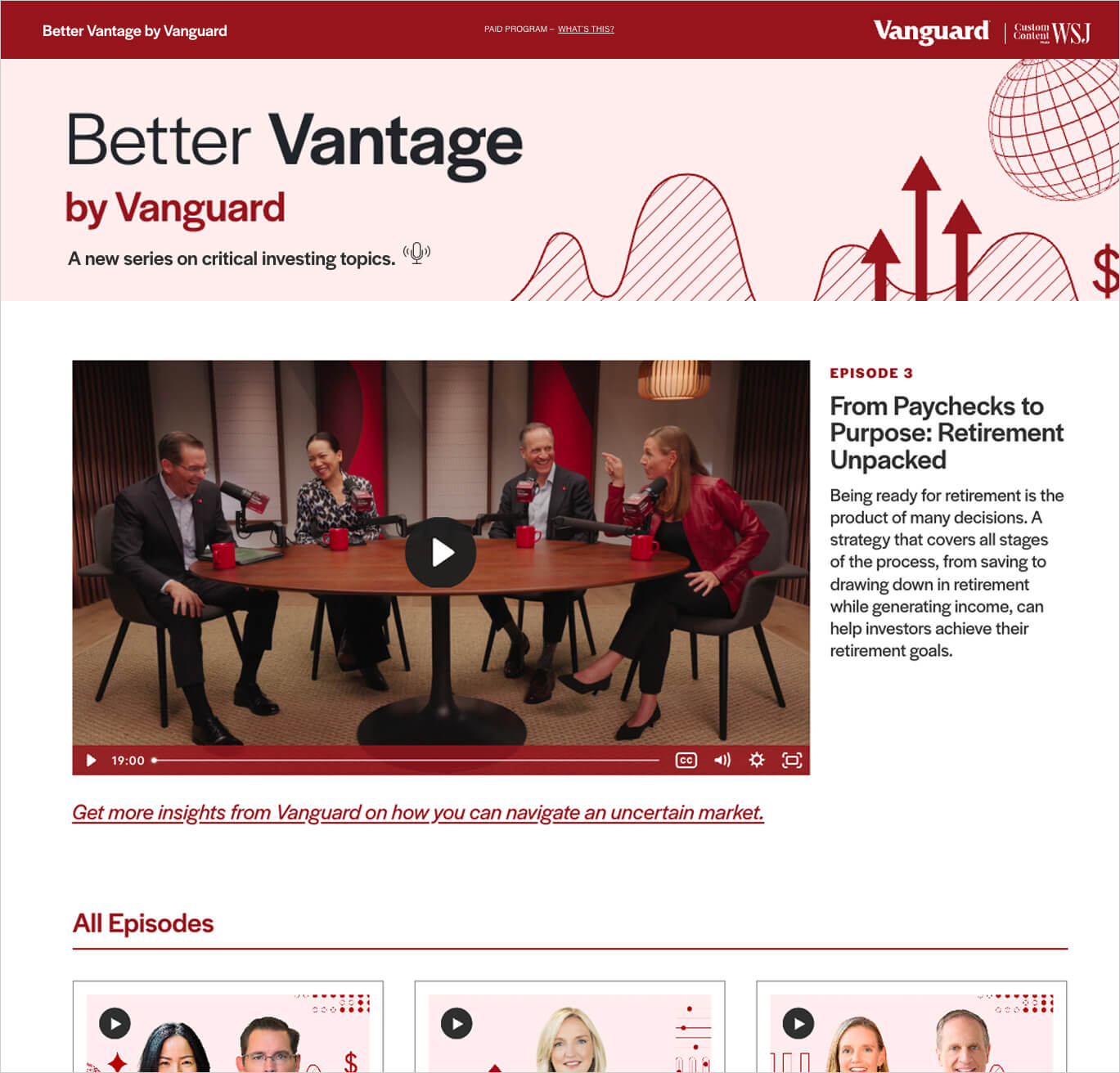 Execution was intentionally omnichannel to maximize impact. Full-length episodes were produced in both video and audio formats and distributed widely. Video lived on a custom co-branded digital site, Vanguard’s brand site, and YouTube. Audio episodes were distributed through our WSJ Podcast Center and major podcast platforms, including Spotify and Apple Podcasts, ensuring broad accessibility and seamless discovery.