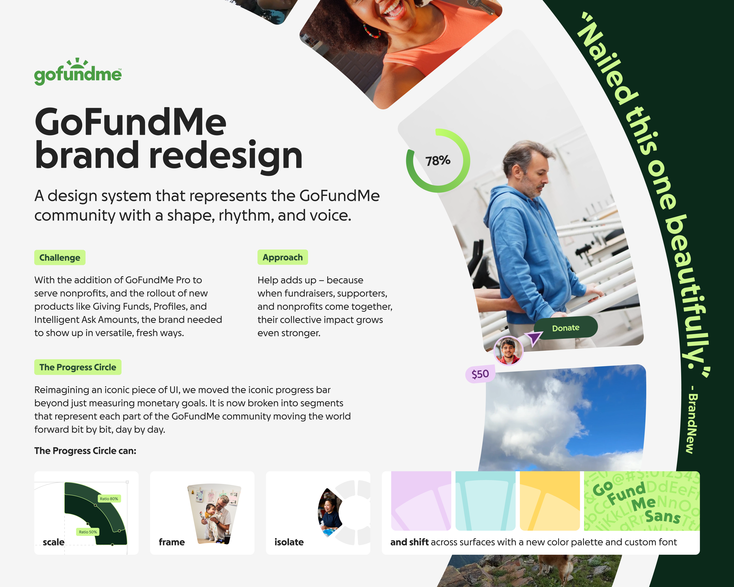 A new custom typeface, GoFundMe Sans, was designed with subtle circular forms and segments that echo the Progress Circle, bringing warmth, approachability, and clarity to every message.