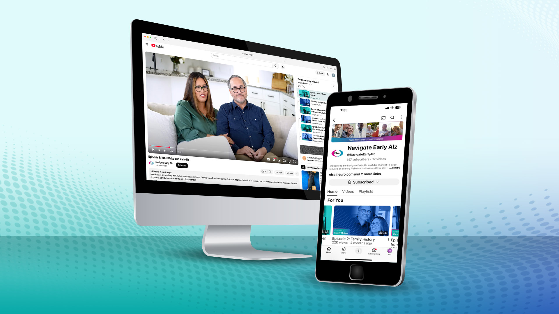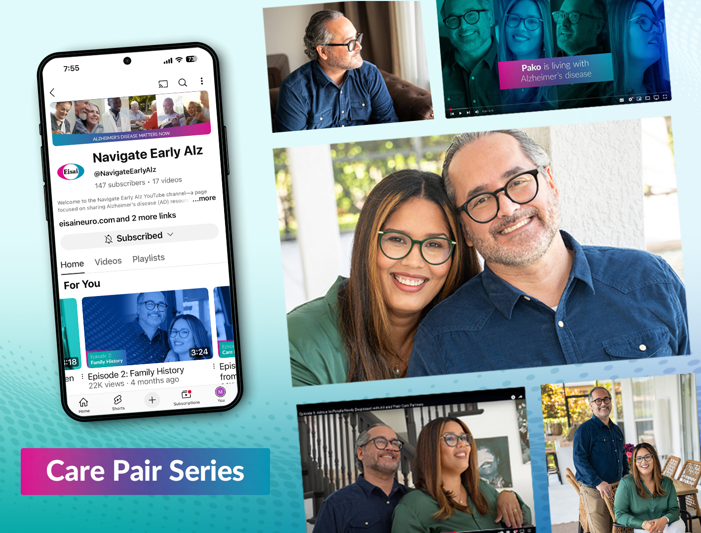 To help drive viewers to the full series on YouTube, short teaser videos and social posts were published across social platforms for the Eisai Neurology and Eisai Corporate channels. Promoting new episodes across multiple social platforms ensured that we could reach a wide swath of members of the AD community—including individuals who are diagnosed with AD, their care partners, people who may be at risk for AD, and health care providers who are interested in learning more about patient experience. Social posts employed multiple hashtags, such as #EndAlz and #AlzheimersDisease, to bring the campaign to wider attention while driving viewers to the full-length episodes on YouTube.
