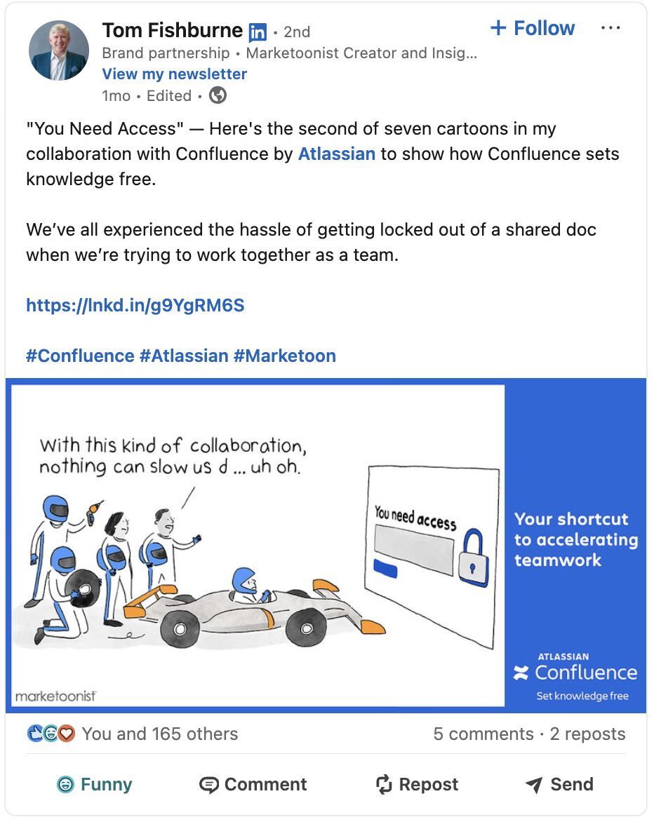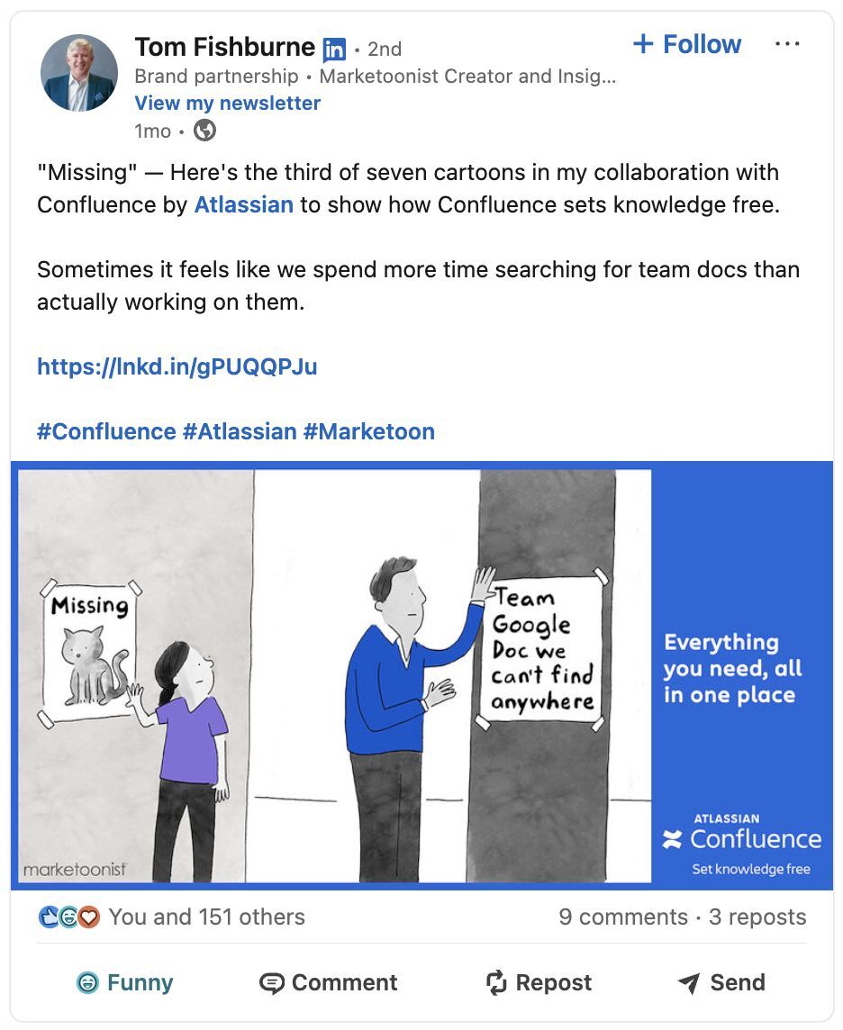 On LinkedIn, we partnered with Marketoonist to create a 12-part series turning broken workflows and tool overload into comic relief. Shared in a format already trusted by marketers and PMs, the cartoons embedded Confluence directly into workplace culture — reinforcing its role as a clarity engine and expanding credibility across professional networks.
