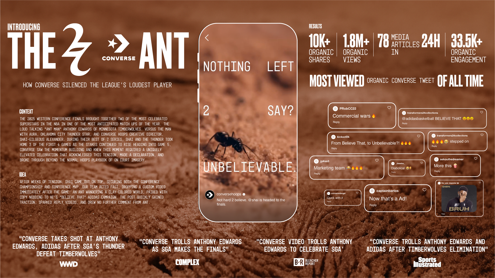 Within 24 hours, the post not only transcended social media, but earned over 78 pieces of earned media coverage -- including headlines from Sports Illustrated, Complex, WWD, Bleacher Report, Sole Retriever, Newsweek and many more, cementing Converse’s voice as one of the boldest in the game.