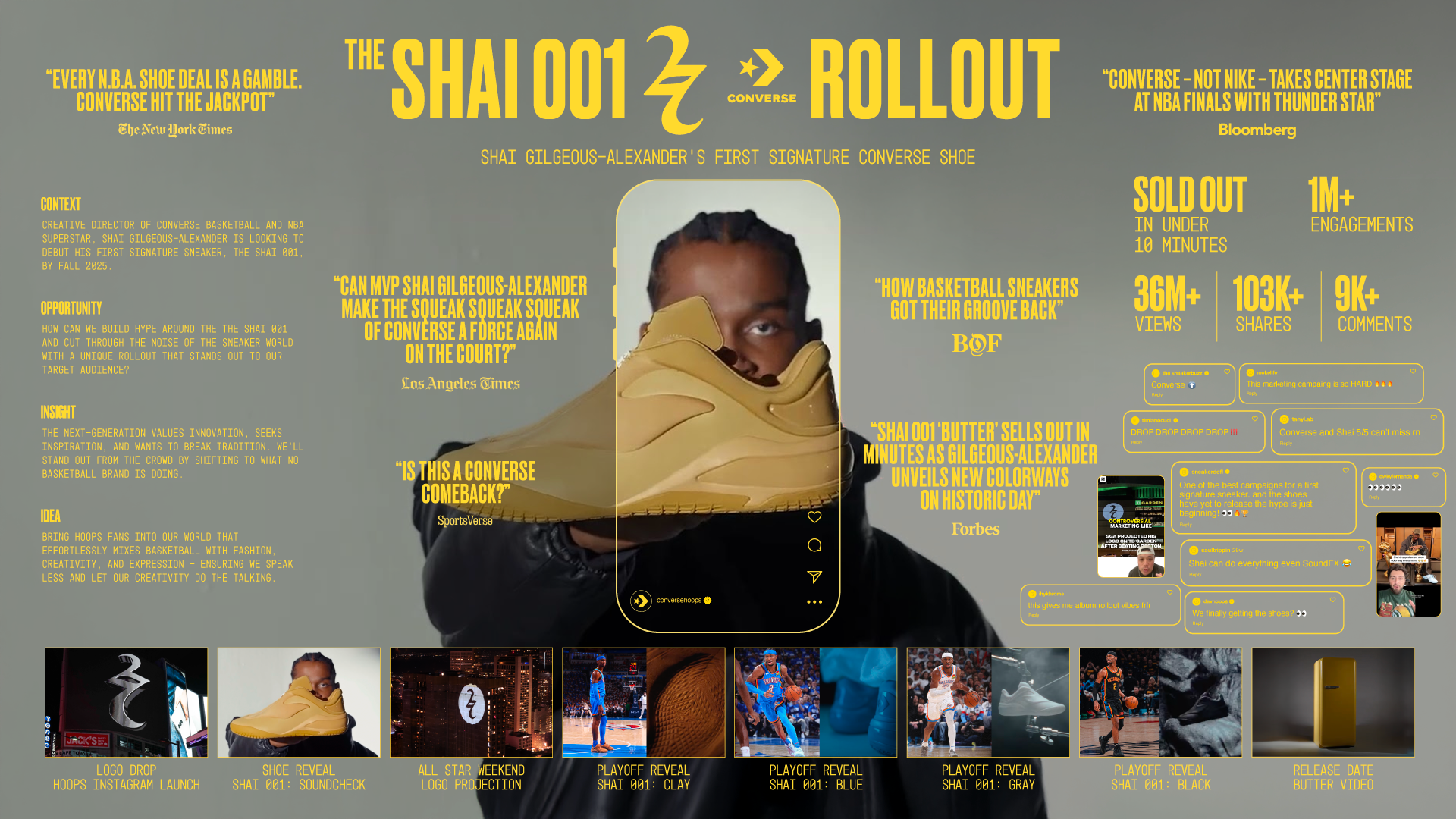 The SHAI 001 commercial launch spoke volumes, becoming Converse’s most successful basketball drop to date. Fans continued to take notice as the campaign garnered 360M+ total views and 1M+ engagements (and counting). Every single colorway drop sold out in minutes, breaking records and proving the agency’s 9-month rollout to be strong and steady.
