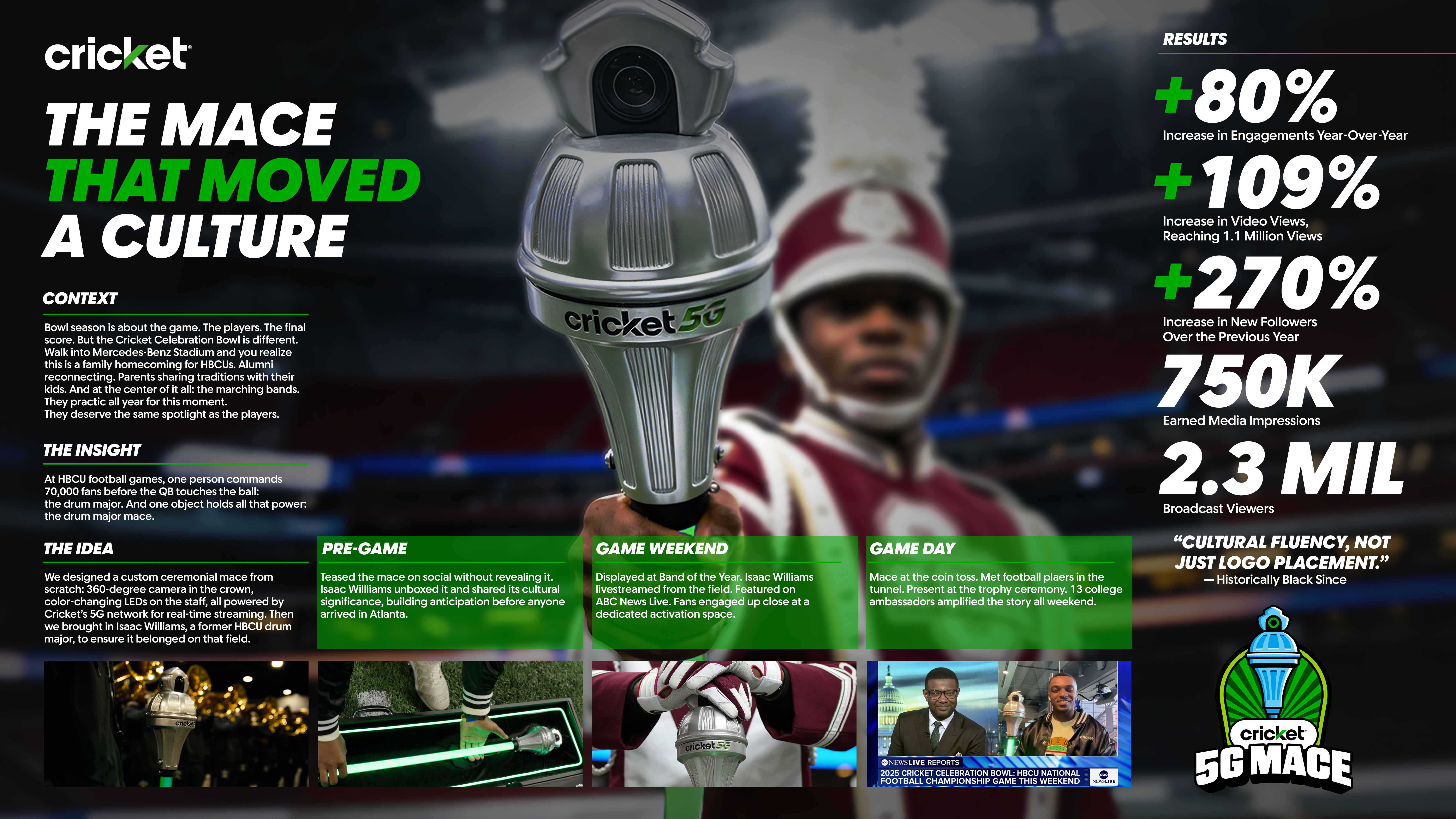 Broadcast Integration: The mace was featured on ESPN during the coin toss, halftime coverage, and trophy ceremony. 2.3 million broadcast viewers saw the Cricket 5G Mace. Then they saw the content it captured live and as recaps in their social feeds.