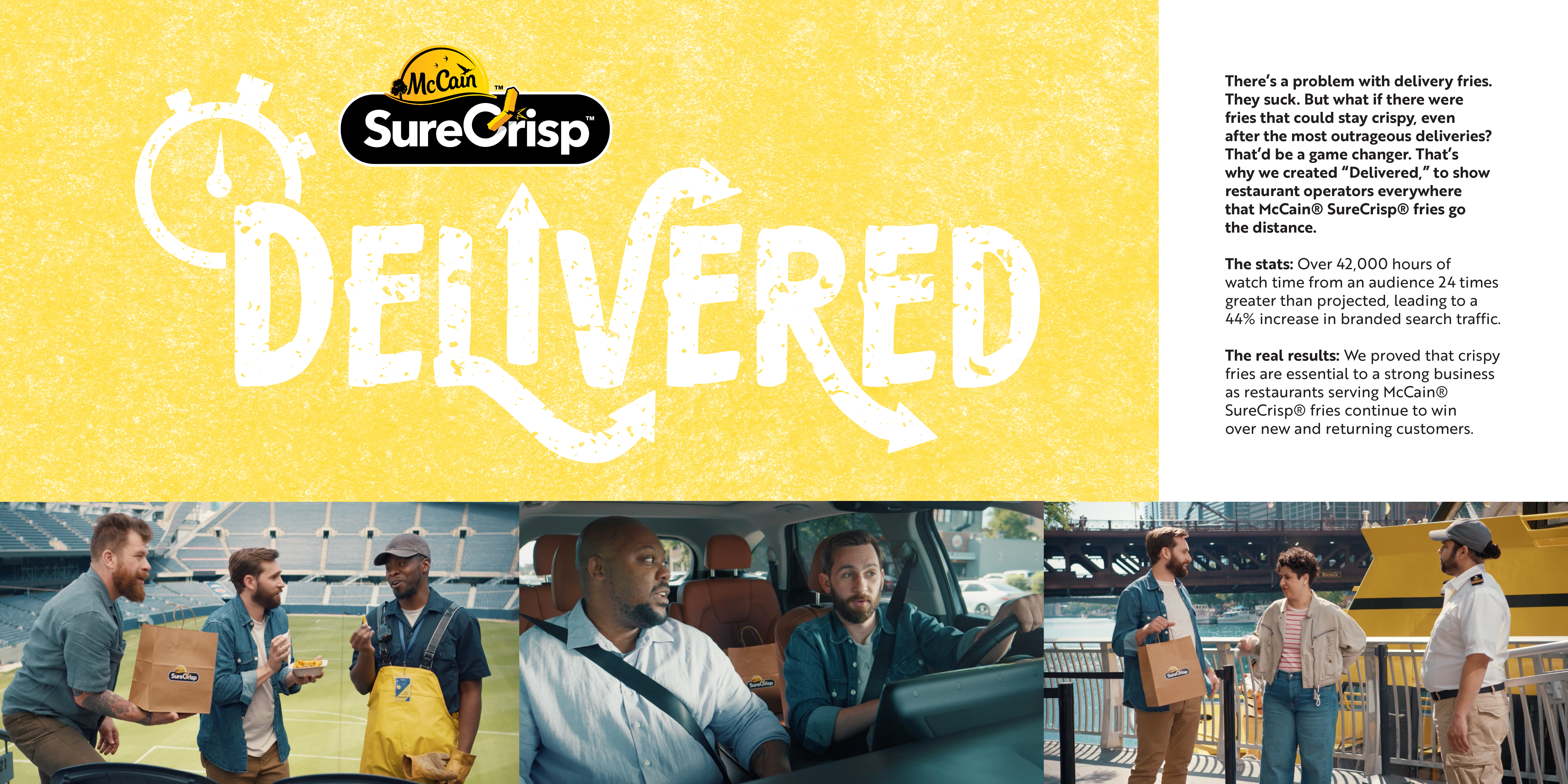 With the launch of a new McCain® product, SureCrisp®, fries are designed to stay crispy no matter how long a delivery order takes. To launch this new product, we created Delivered, a three-episode social series, featuring relevant food influencers, that takes viewers on some seriously challenging deliveries, full of twists and turns, to show how sure of a bet SureCrisp® is. Because more satisfied diners means better business for operators and better business for McCain.