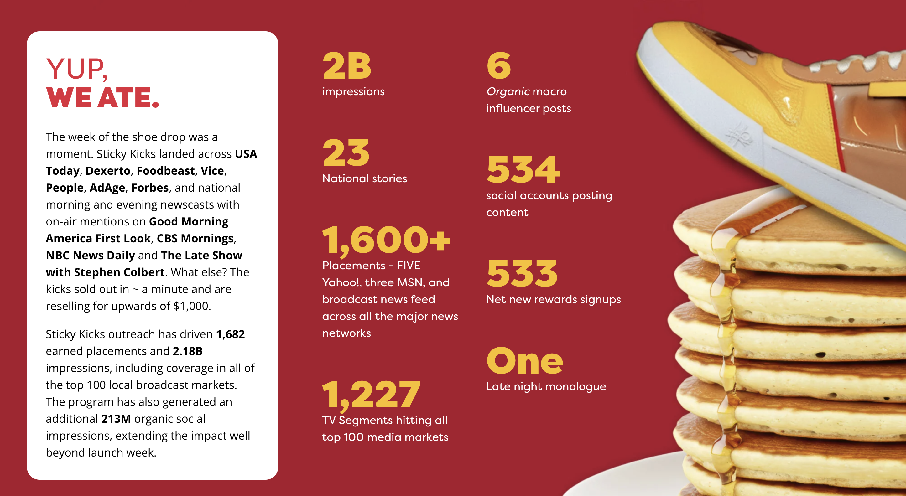 Sticky Kicks, the first-ever sneakers with real syrup inside, basically took over news and social media for about three weeks with of wall-to-wall media coverage in the likes of USA Today, Dexerto, Vice, Good Morning America First Look, CBS Mornings, NBC, and a bit during The Late Show with Stephen Colbert.