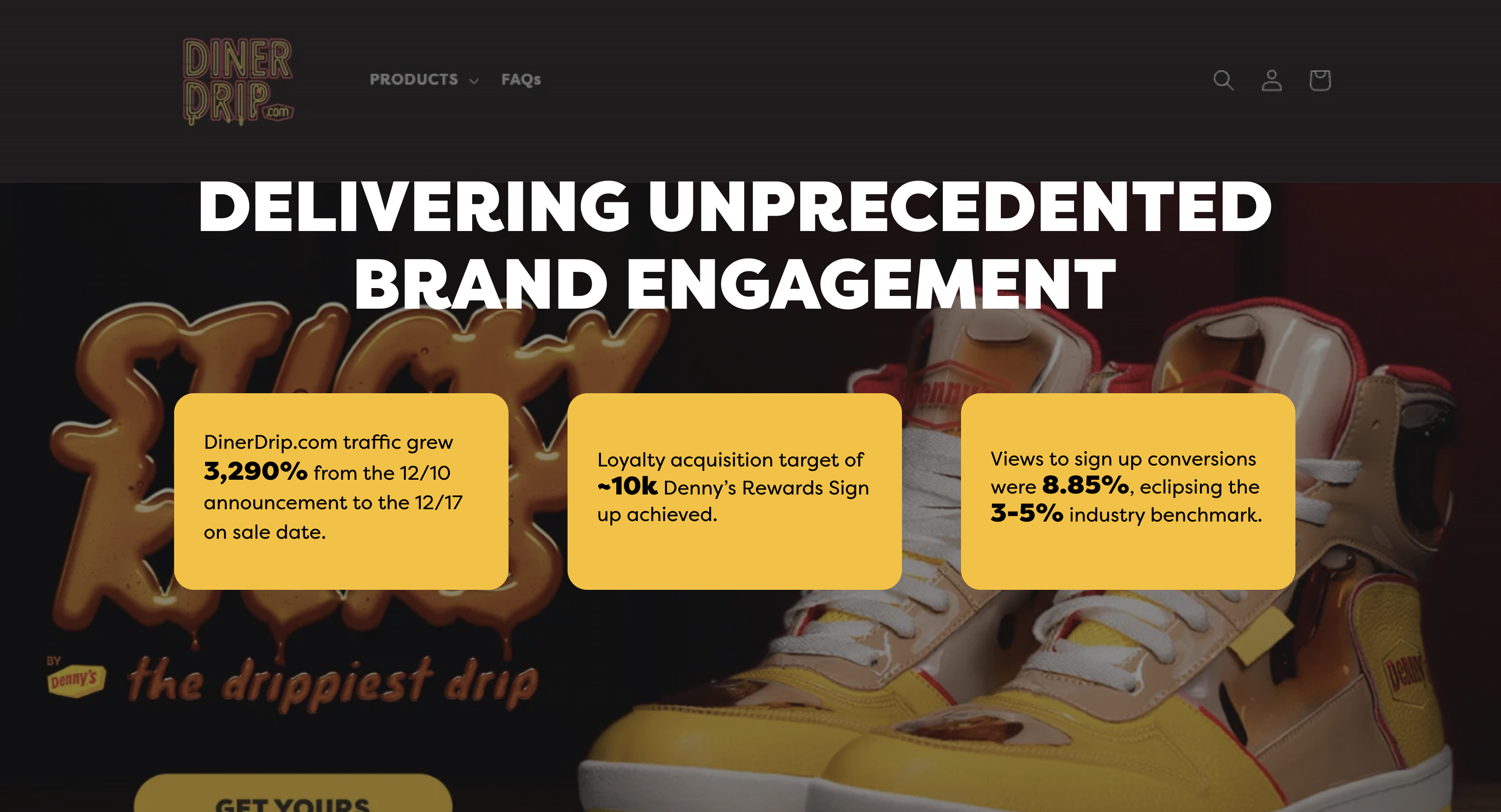 We revealed the shoes one week out, leveraging social media, media relations, and Denny’s swaggy assets to drive more chatter and sign-ups for the Denny’s Rewards program, as members would receive VIP access.