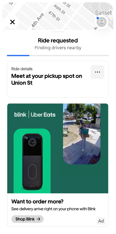 By embedding these moments across Uber Rides and Uber Eats—particularly during the high-attention Post-Checkout window—the campaign reached users when engagement was naturally high. Blink’s HD video, head-to-toe framing, person detection, and two-way audio were demonstrated seamlessly, letting the product tell its own story.