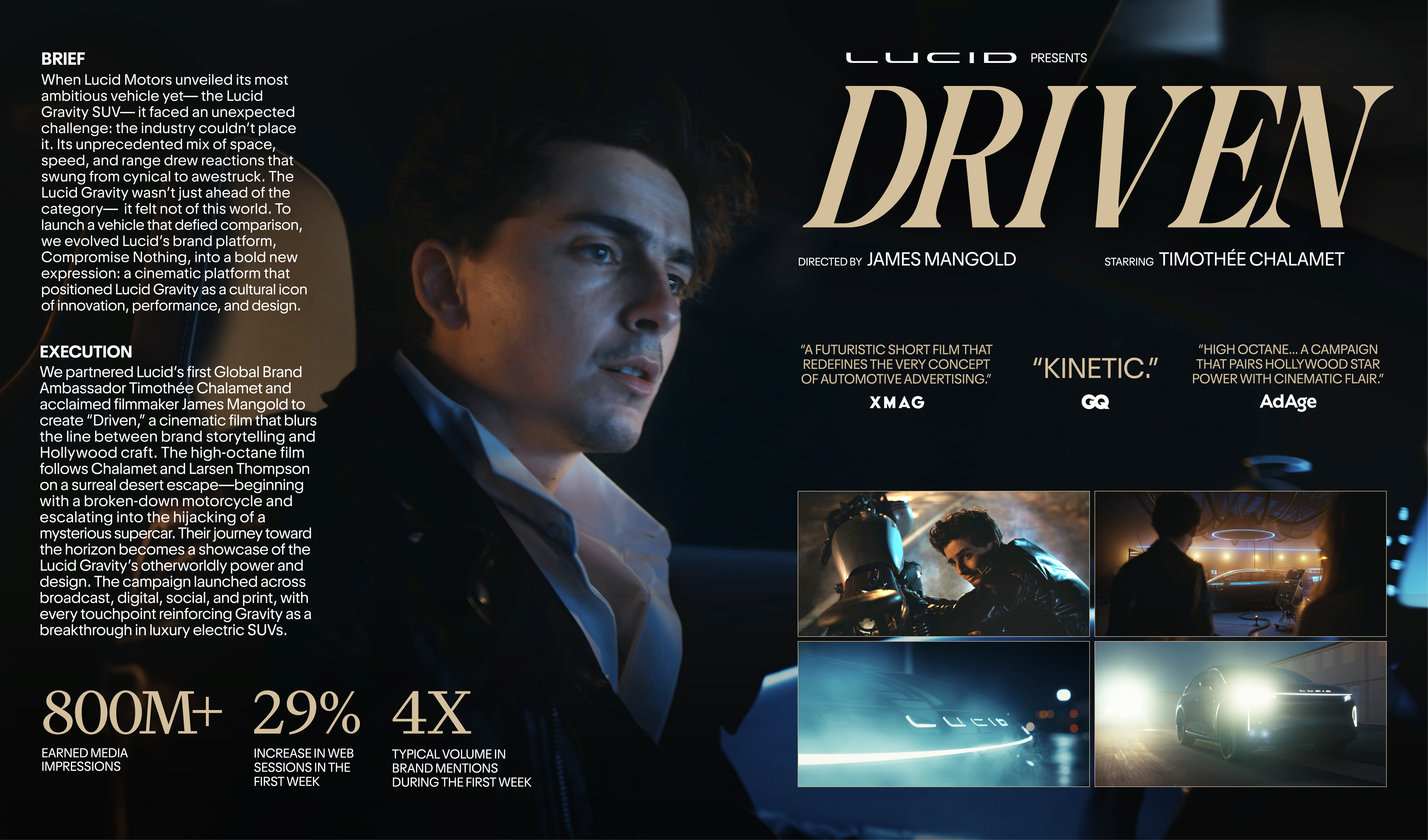 We partnered with Lucid’s first Global Brand Ambassador, Timothée Chalamet, and acclaimed filmmaker James Mangold (“A Complete Unknown”), creating work that blurred the boundaries between brand storytelling and Hollywood filmmaking.
