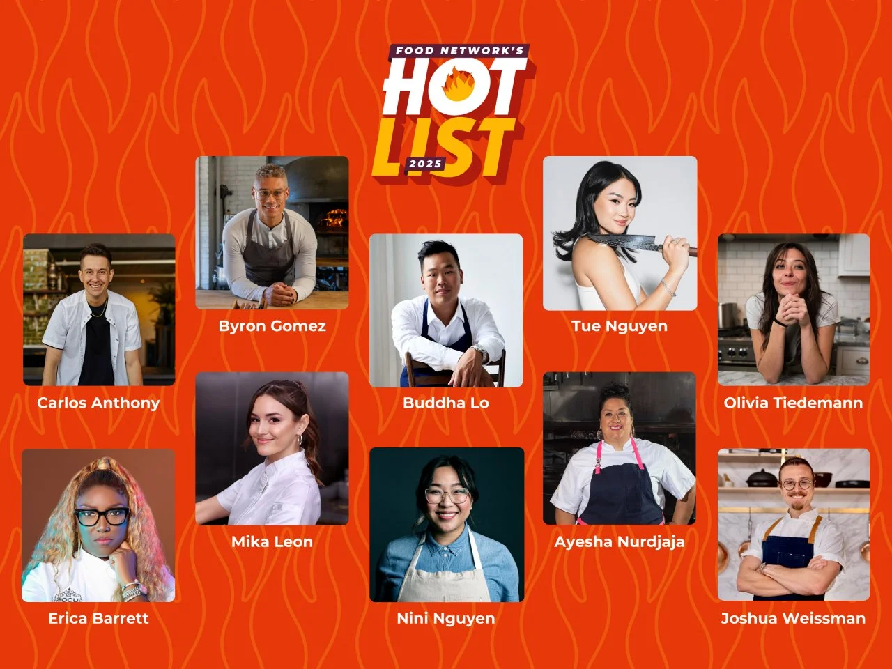 The 2025 ‘Hot List’ was announced on the Emmy-nominated daytime series The Kitchen, where Hot Listers Byron Gomez and Nini Nguyen joined the hosts to chat all things Hot List and share some of their best culinary tips and recipes. The year’s Hot List members consisted of: chef, content creator and Tournament of Champions VI competitor Carlos Anthony, entrepreneur, master of ‘cue and winner of BBQ Brawl Season 5, Erica Barrett, chef at a Michelin-star restaurant and judge on Chopped, Byron Gomez, chef, restaurateur and 24 in 24: Last Chef Standing season one semi-finalist Mika Leon, Top Chef winner Buddha Lo, chef, cookbook author and Tournament of Champions VI competitor Nini Nguyen, food content creator, cookbook author and restaurateur Tue Nguyen, James Beard Award nominee, acclaimed restaurateur and Bobby’s Triple Threat Titan Ayesha Nurdjaja, private chef and food content creator Olivia Tiedemann and viral culinary social media personality Joshua Weissman. The Hot List stars were introduced one day at a time on Food Network’s social platforms, and featured in various social videos, including their very own culinary “Hot Tips”, favorite recipes and exclusive Q&A’s.