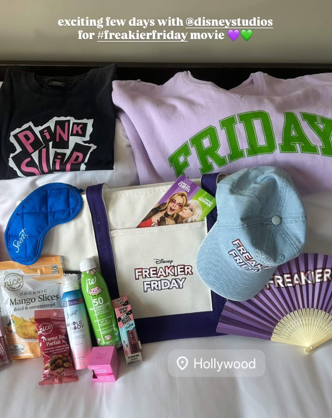 In addition to theming up each creator’s hotel room to Freakier Friday, we also worked with our promotional partners to curate gift bags for our creators upon their arrival at the Roosevelt Hotel, which included Old Navy (athletic set, for mat pilates on the beach), Walgreens (snacks, make-up, skincare, self-care items), Angara (jewelry for the premiere), in addition to Freakier Friday-themed items designed and sourced by Experiential Supply.