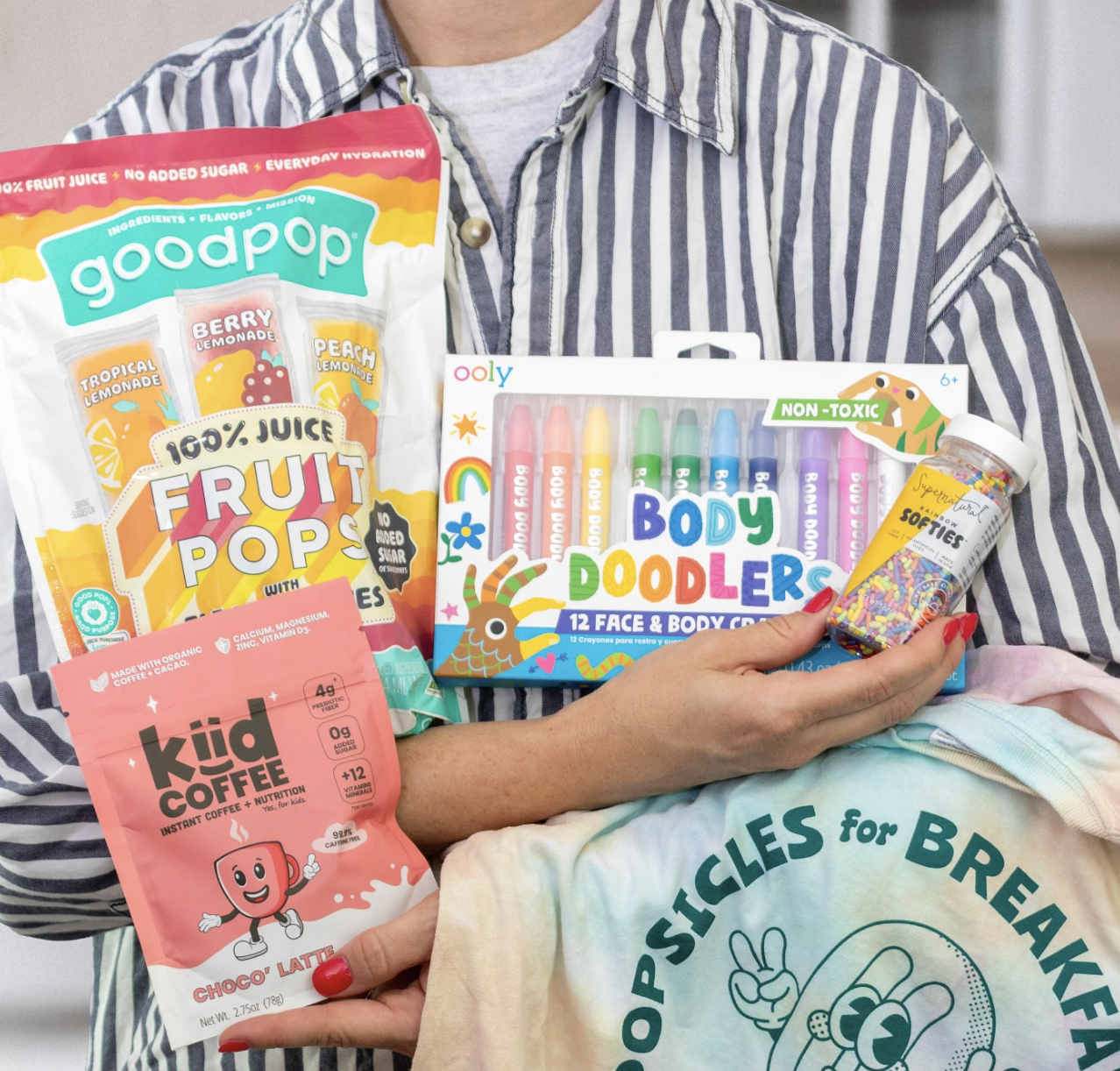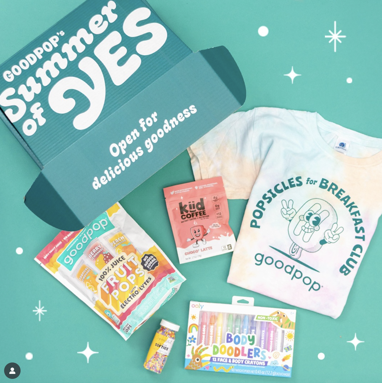 Expanding on this idea, the Summer of YES Kit offered a curated “Yes Kit” set of low-stress, high-play items meant to lighten parents’ mental load and create summer memories. With Electrolyte Freezer Pops, OOLY Body Doodlers, natural dye-free sprinkles, Kiid Coffee, googly eyes, and a whimsical “Popsicles for Breakfast” t-shirt, the kit gave families ready-made ways to create fun without added prep or pressure. GoodPop sent 50+ kits to parenting creators around the country. Families could win their own through June Instagram giveaways — giving parents tools to spark imagination while removing the work usually required to make magic moments happen.