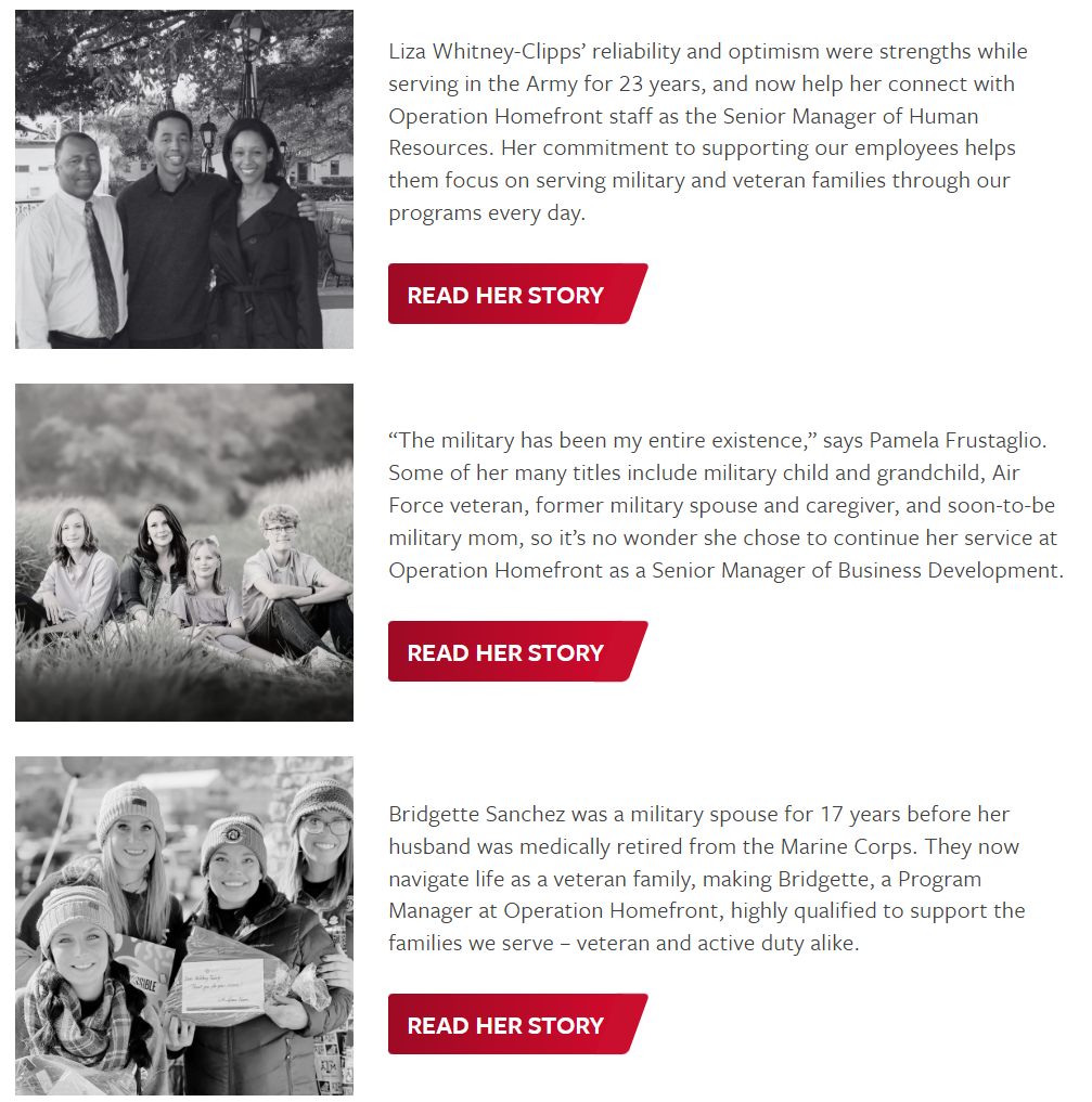 To compliment the videos, we shared written interviews featuring staff from HR, Development, and Regional Programming to share their deep connections to the military (including veteran, military spouse, caregiver, and military child) and why they chose to continue their service at Operation Homefront.