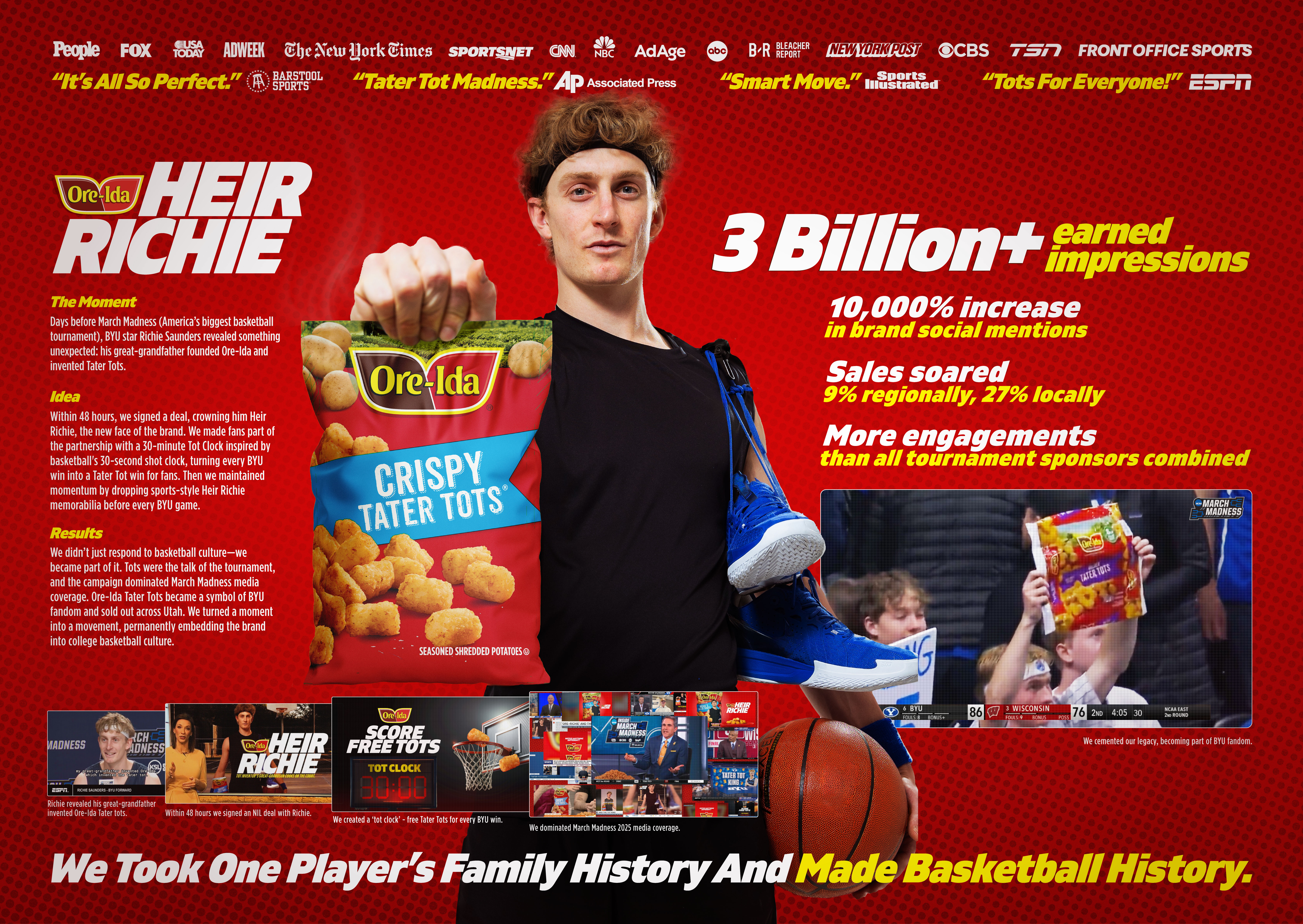 The unexpected partnership dominated March Madness media coverage, getting featured on every major sports TV broadcast and earning over three billion earned impressions. We used every unpredictable moment of the tournament to create instant topical content and conversation around the partnership that saw a 21,700% higher engagement rate than X’s average, leading to a 10,000% spike in brand mentions on social media. Ore-Ida Tater Tots sold out across Utah, and without a March Madness sponsorship, we drove more engagement than all the official sponsors combined - at just 0.04% of their spend. In the end, Richie’s influence and popularity helped us regain relevance with the new generation, cementing Ore-Ida as an indispensable part of BYU fandom, all in just a 2-week span.