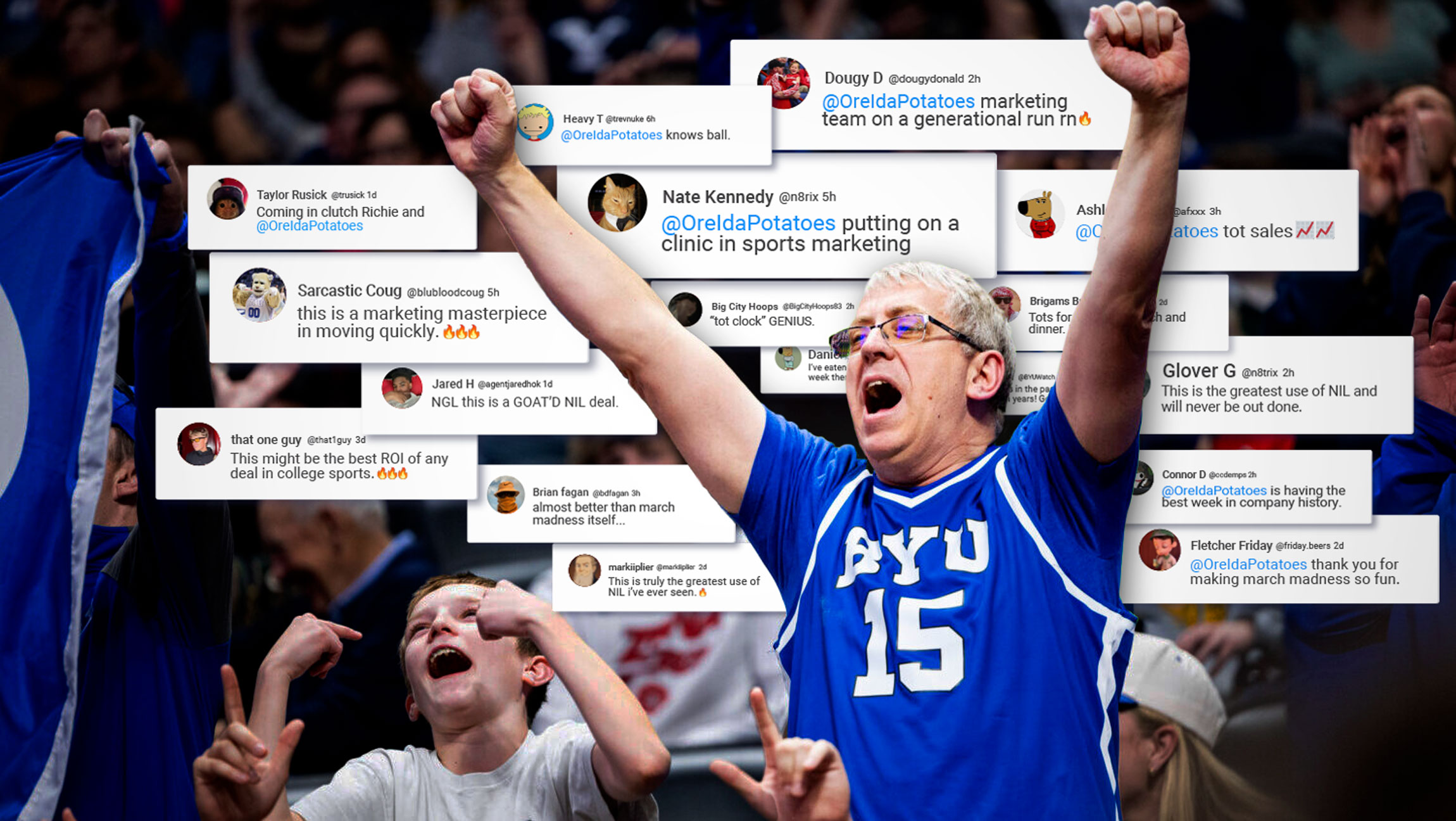 Just days before March Madness, BYU basketball star Richie Saunders revealed that his great-grandfather founded Ore-Ida and invented Tater Tots. What could have been a passing fun fact became our opening. To intercept this key cultural moment and win back points amongst disenfranchised audiences, our strategy was simple, but potent: 1) Swiftly partner with Richie as a way to open the door for us to authentically enter the conversation, 2) Highlight and celebrate Richie’s Ore-Ida heritage to naturally position the brand in the context of March Madness, 3) Fan the flames of fandom for Richie’s BYU Team so fans can partake in the action.