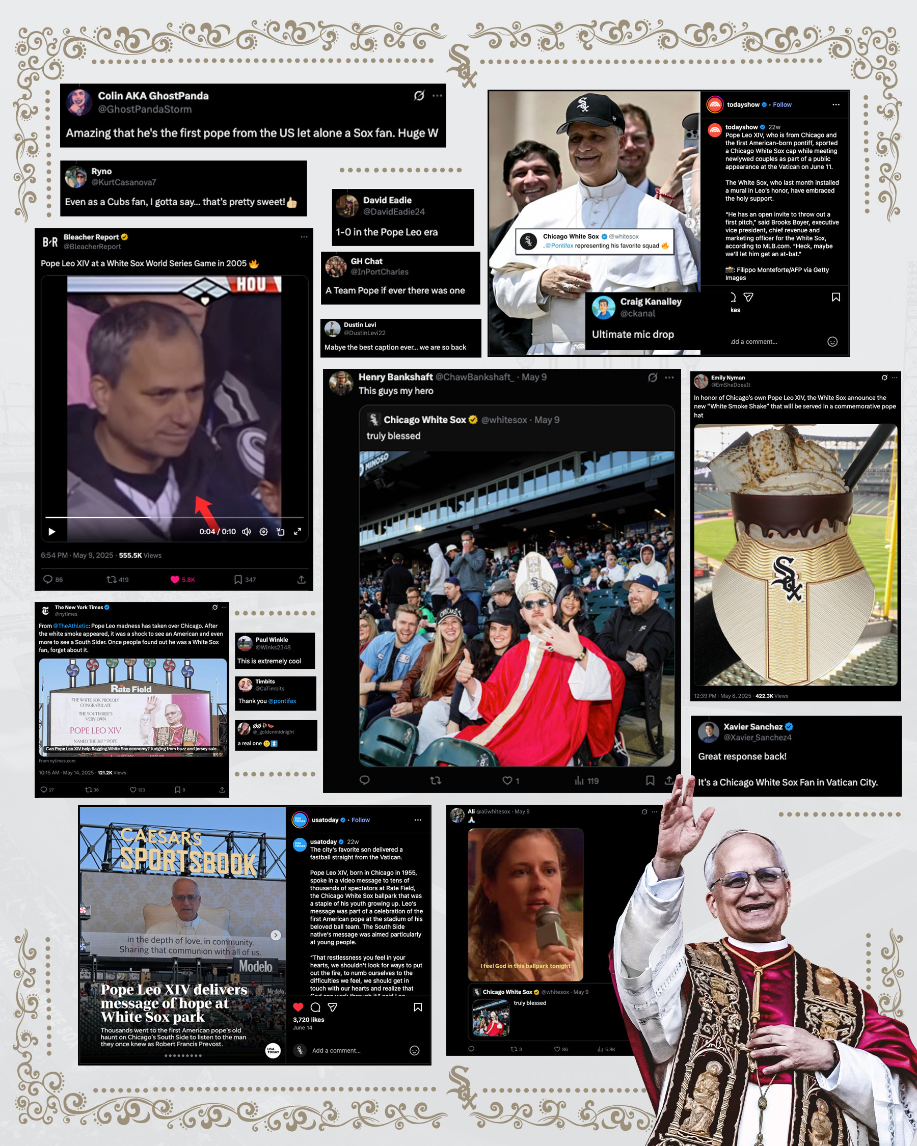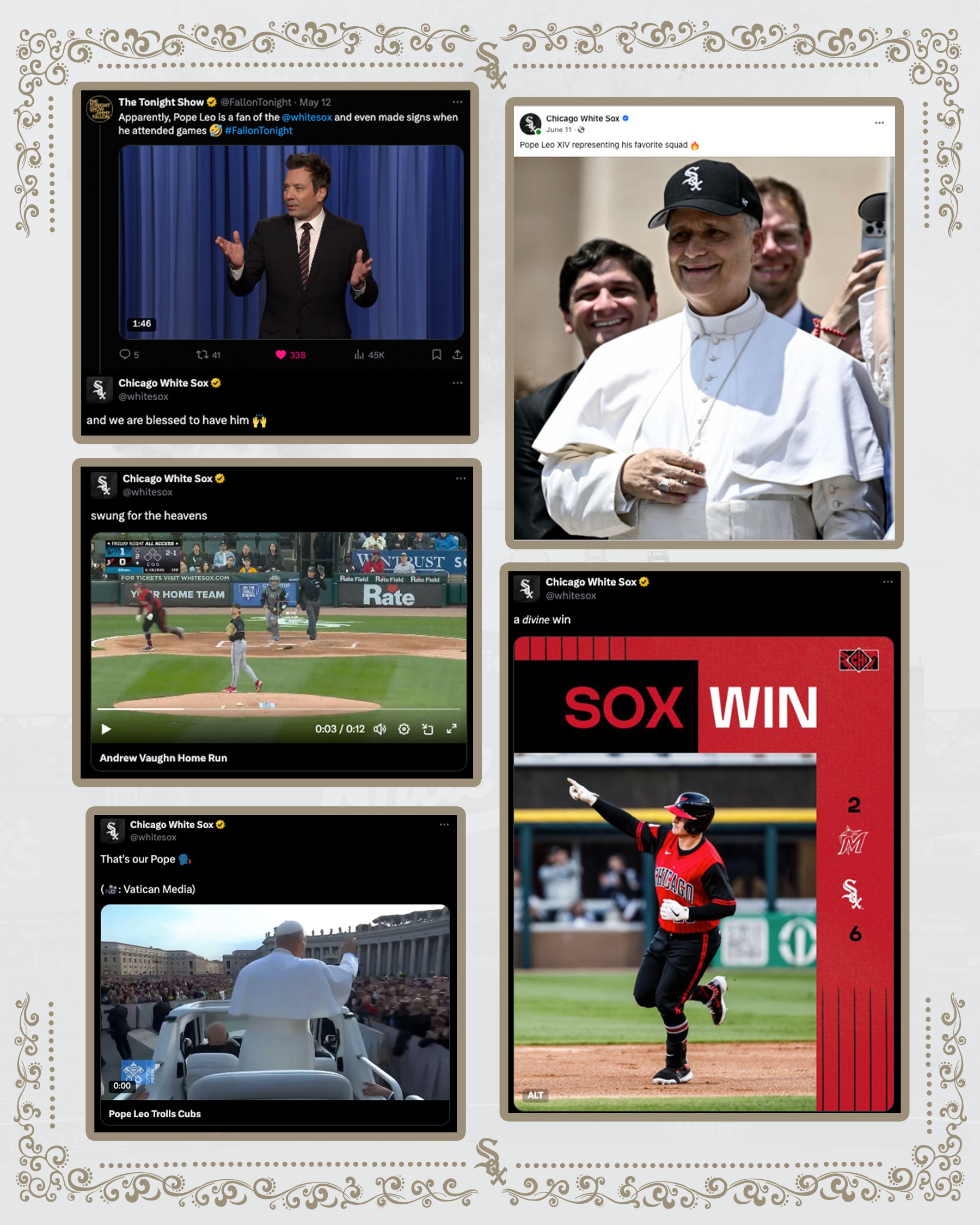 As a team, we understood how influential the Pope is around the world. We viewed this as an opportunity to spread appreciation and connection. We began a posting strategy that included an immediate response on our own scoreboard, announcing him as a White Sox fan alongside a personalized jersey and video of his brother confirming his fandom. This was done to create a clear message while also throwing a little humorous shade at our northern neighbors for claiming him too quickly.