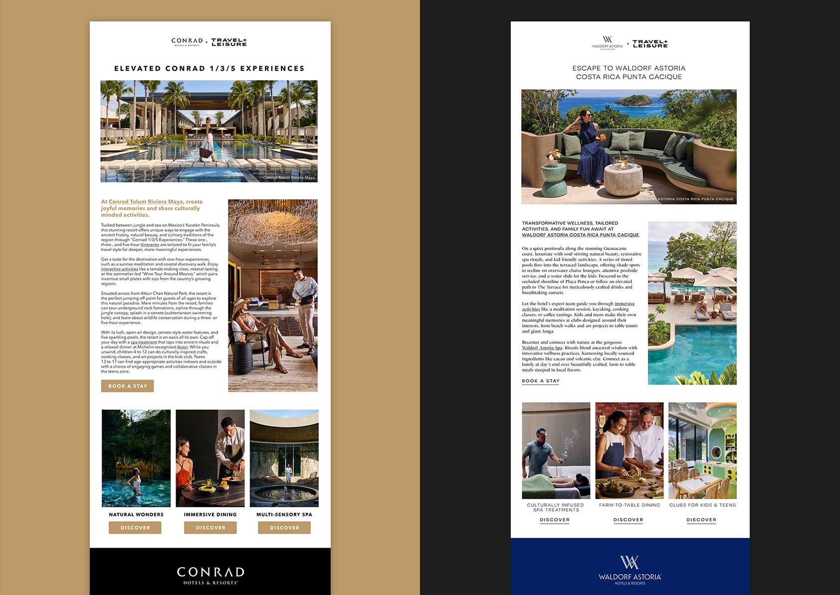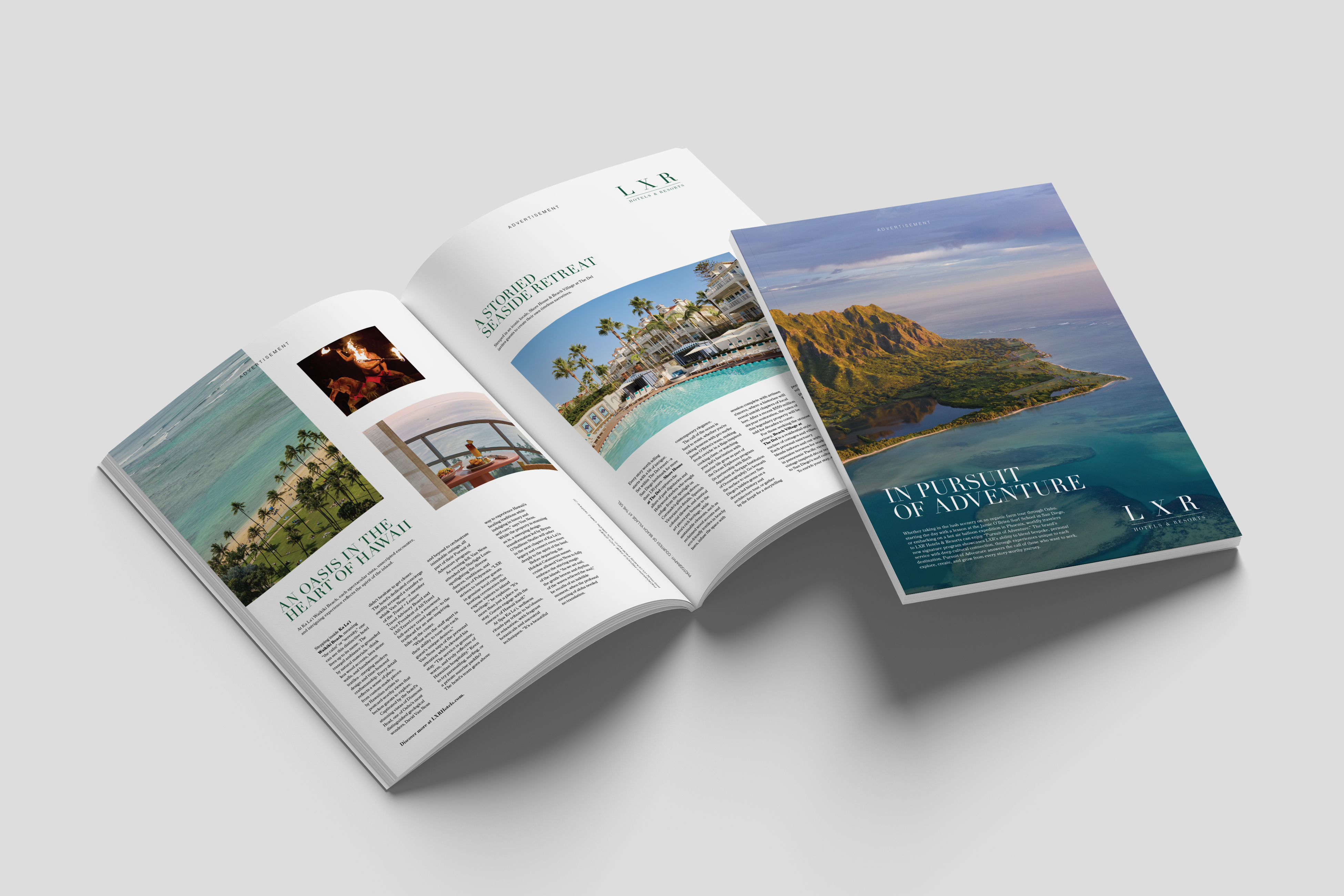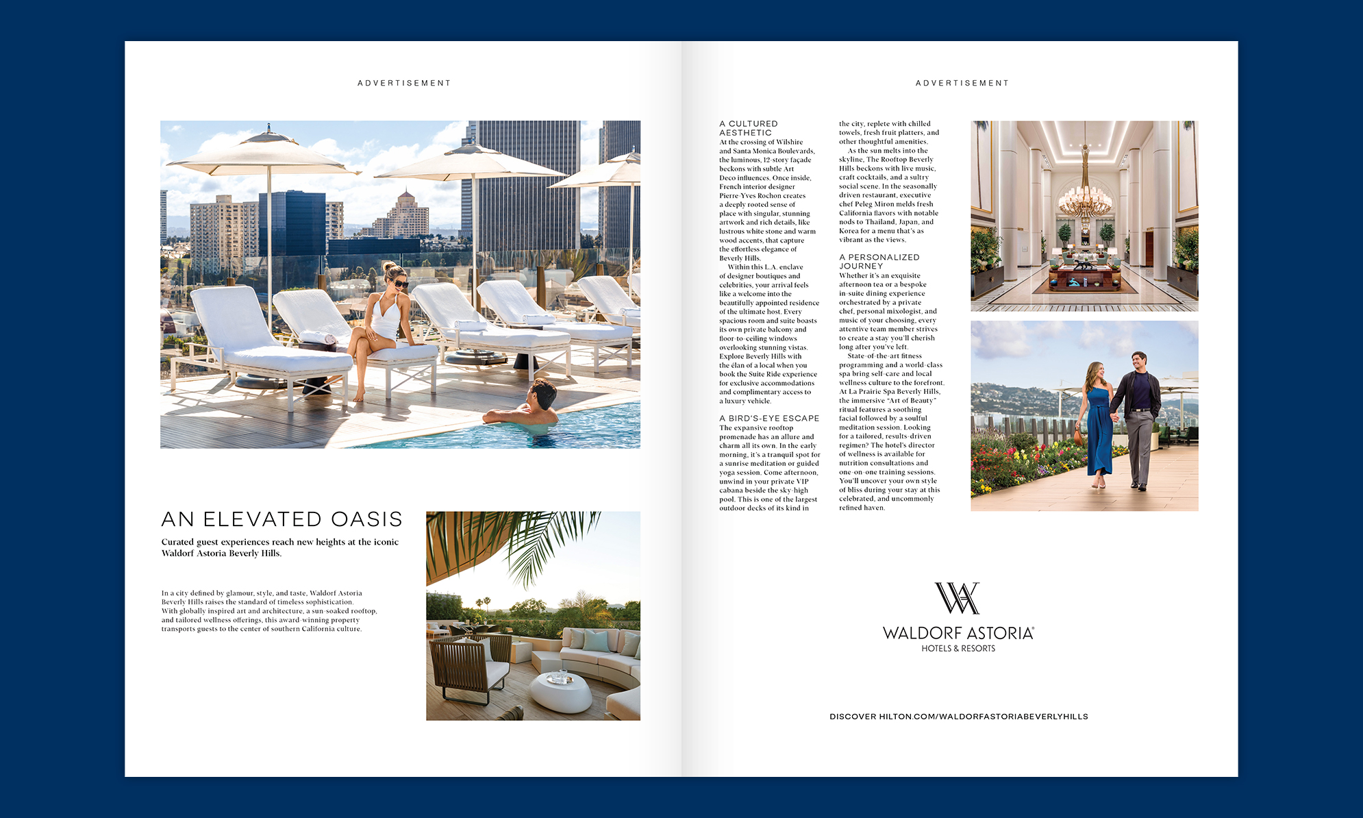 High-Impact Print: We produced a total of twelve (12) custom in-book executions—including a four-page Waldorf Astoria New York gatefold—that delivered immersive premium storytelling with luxurious photography.