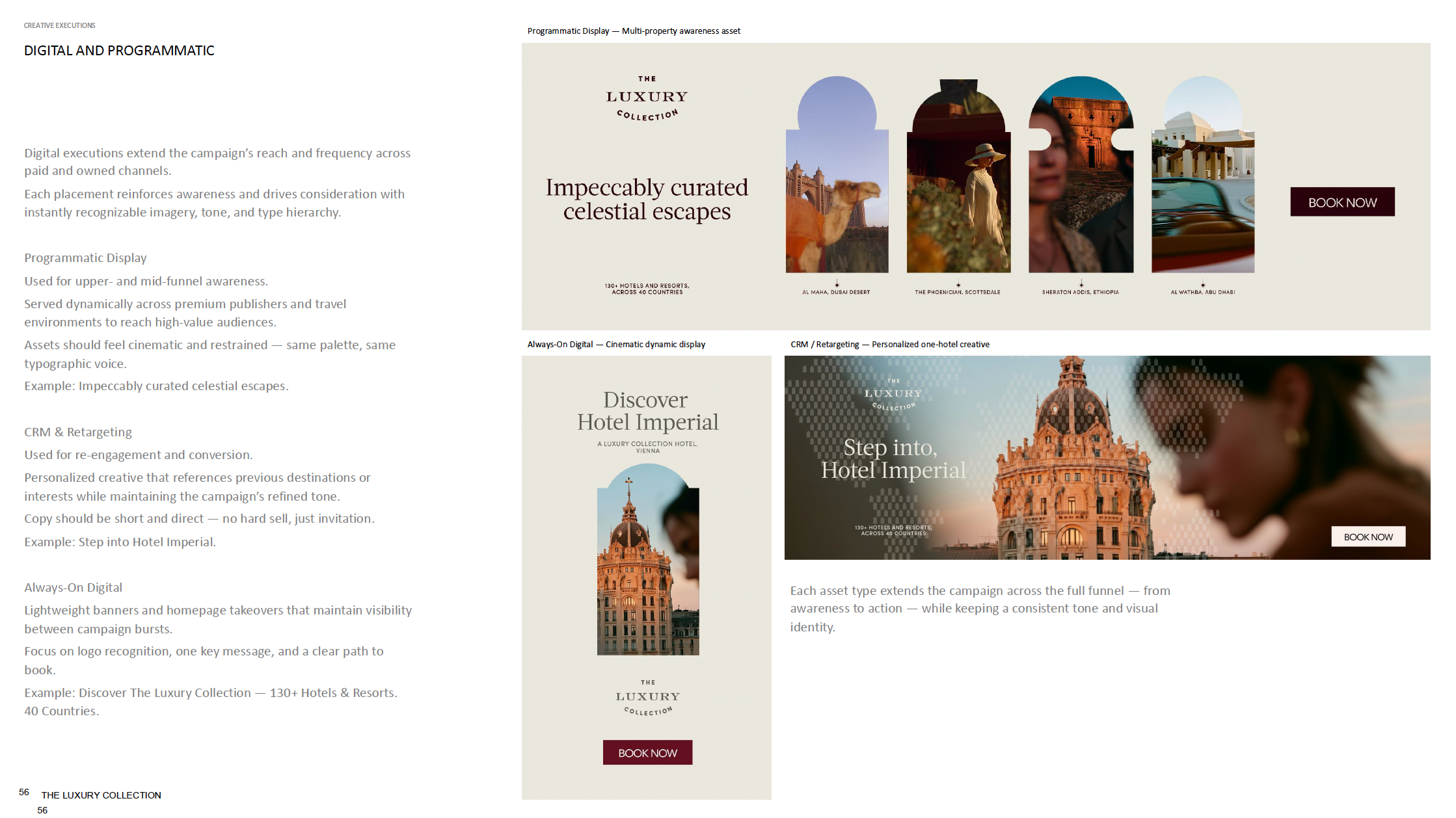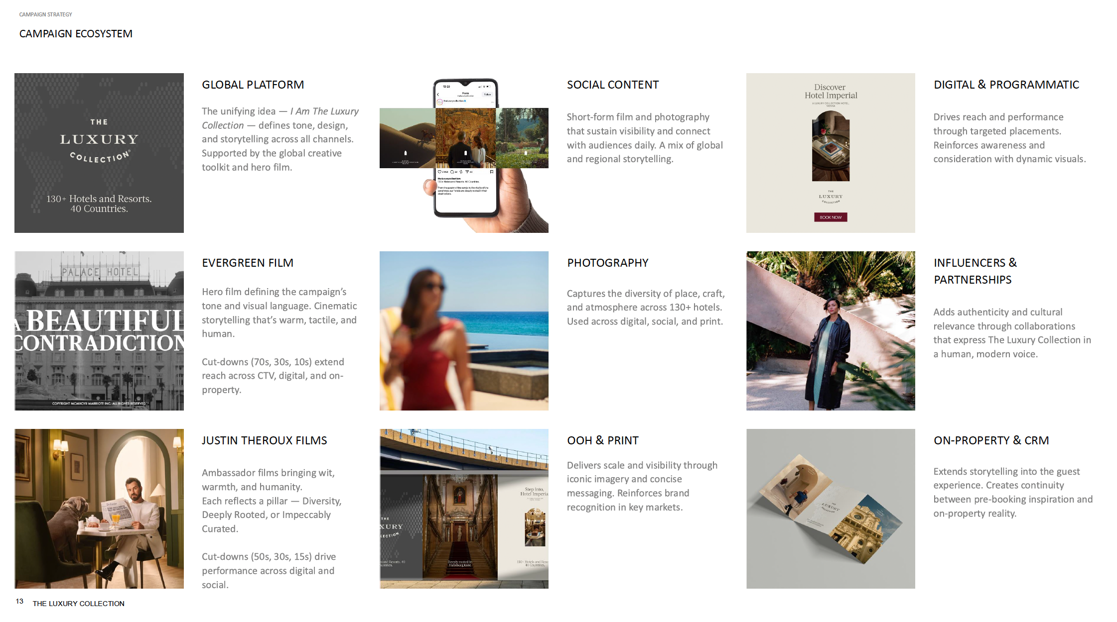 “I Am The Luxury Collection” redefines global luxury marketing by solving a challenge most heritage portfolios never do: unifying scale without sacrificing soul. Instead of imposing sameness, the campaign turns individuality into the strategy—elevating 130+ distinct hotels into a coherent, human, and culturally resonant brand voice. Through cinematic storytelling, a warm and unexpected celebrity curator, and a fully integrated global ecosystem, the work breaks category conventions of distant, transactional luxury marketing. More than a campaign, it is a brand transformation—one that delivers measurable gains in brand comprehension while creating emotional connection across continents. In a moment when luxury is being rewritten around meaning, culture, and authenticity, this work sets a new benchmark for how modern brands speak, connect, and endure.