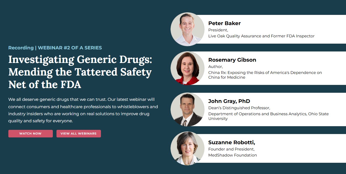 MedShadow reached over 100,000 people with its webinar promotions, and had close to 500 registrants and 260 newsletter subscribers. The webinars offered value through expert speakers from globally influential organizations, such as Yale School of Medicine, The Brookings Institution, FDA (former inspector), Ohio State University, The People’s Pharmacy, Valisure, and the award-winning authors of Bottle of Lies and China RX. Two of these speakers also presented to the Senate Committee on Aging within weeks of our events with them, further driving national conversations about issues and solutions. People are encouraged to call their elected officials to share their stories and elevate the visibility of these issues.