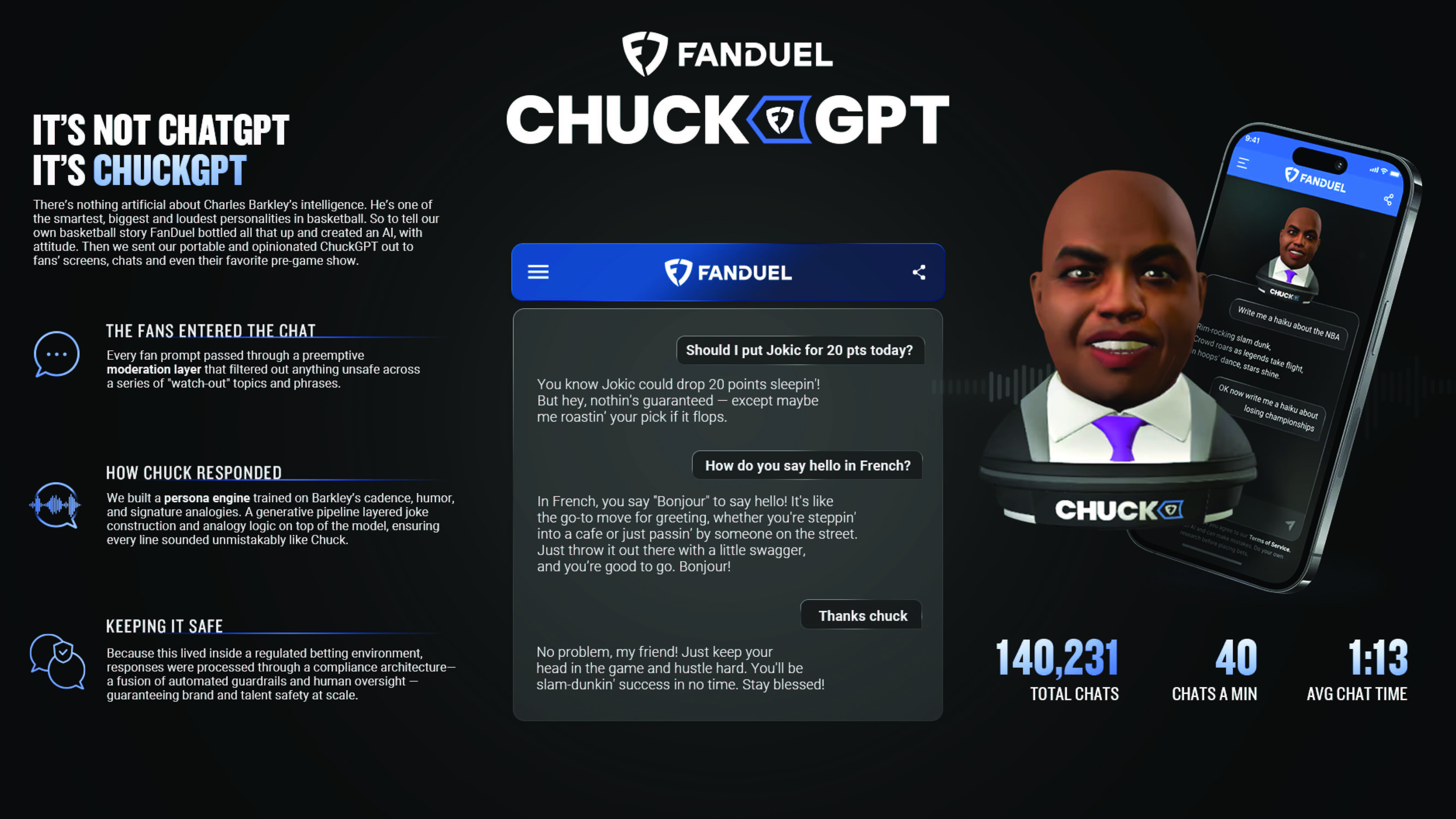 In 2024 AI was suddenly everywhere - every search, social feed, and cultural trend all centered on it. Leveraging the cultural buzz, FanDuel got above the noise with the loudest voice in sports. We created our own AI with more sass, smarts and rebounds than any that came before it. It’s not ChatGPT, it’s ChuckGPT.