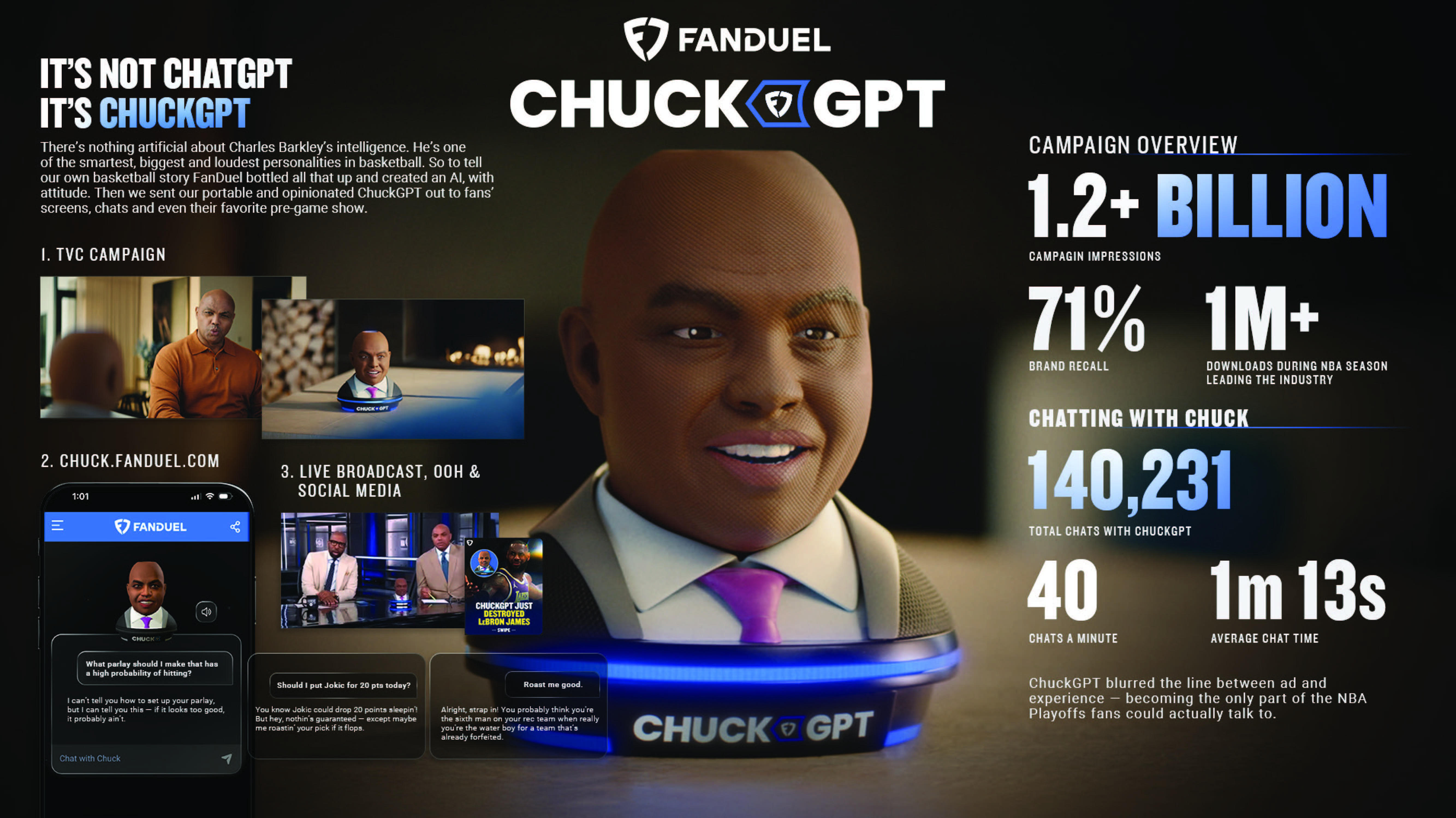 The power tandem of Chuck and ChuckGPT broke through and engaged on every platform - TVC, live studio integrations, social, and live AI chatbot. ChuckGPT puts Charles’ wit in every bettor’s pocket, turning AI into a courtside buddy that’s already roasted 140 K chats (2,300+ fan‑hours).
