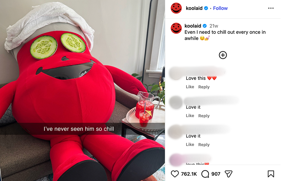 Posted during Self Care Month, the content reframed the famously energetic character as someone who also needed a moment to reset. The juxtaposition between Kool-Aid Man’s chaotic persona and a quiet spa-like break created immediate comedic tension that audiences understood without explanation. Execution prioritized platform fluency.