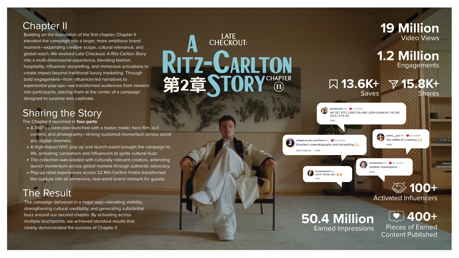 The earned component marked the most successful execution to date for The Ritz-Carlton—setting a new benchmark for future campaigns. Late Checkout Chapter II activated the highest number of partners and generated the greatest volume of earned content across any campaign to date.
