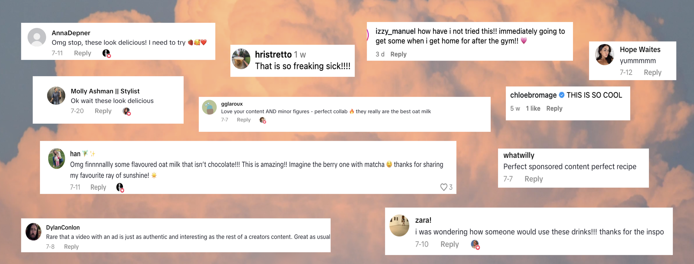 Comments included “Omg finalllllyyy an oat milk that isn’t chocolate flavoured”, “Rare that a video with an ad is just as interesting as the rest of the creator’s content”, and “How have I not tried this?? Immediately going to buy some once I’m out of the gym”.