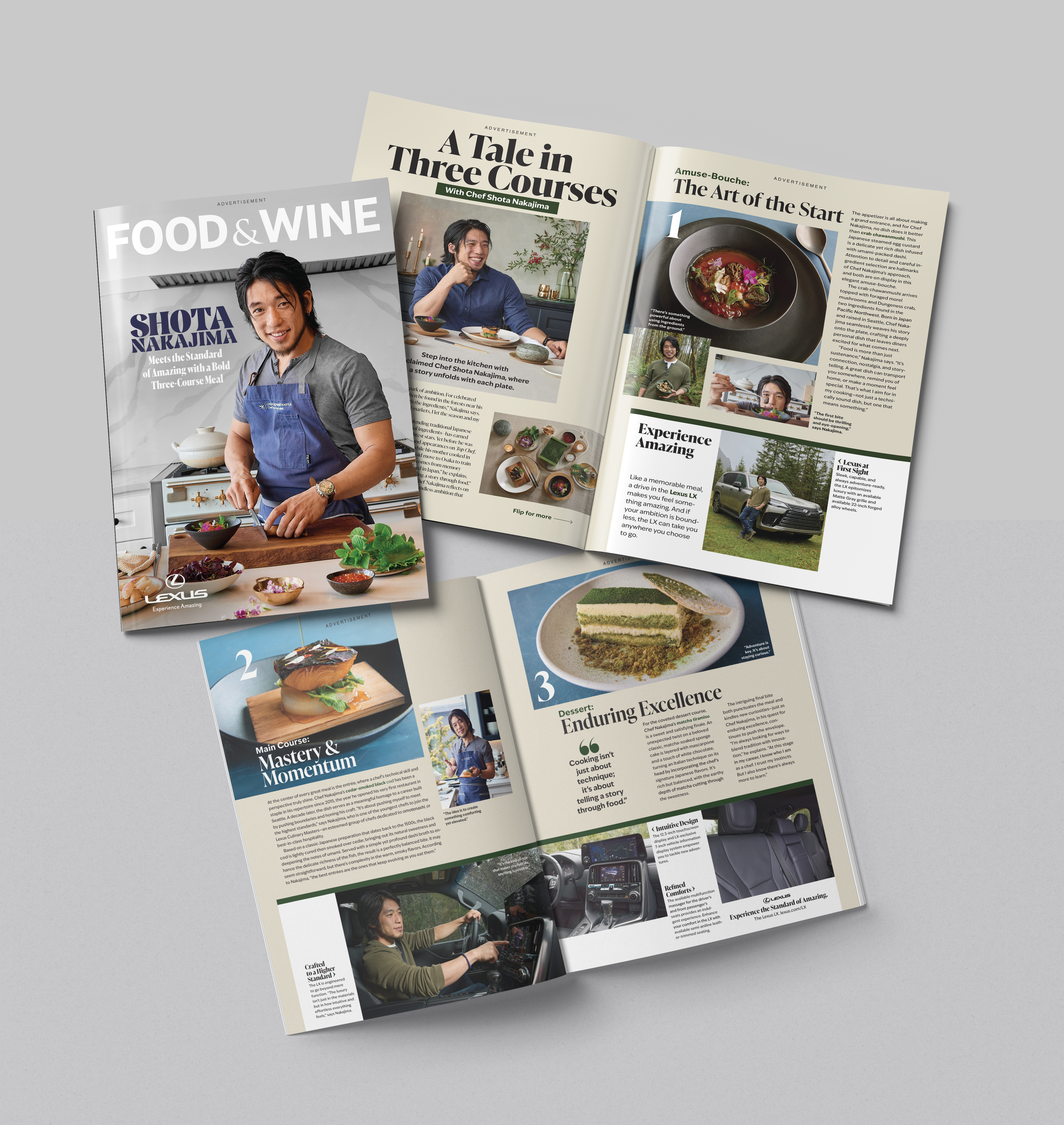 - Course 1 (The Appetizer) launched with the introduction of the latest Lexus Culinary Master, Shota Nakajima, as the face of our “Three Courses” campaign. Rooted in Lexus’ brand platform, “The Standard of Amazing”, the storytelling was designed to elevate culinary craft beyond technical precision, to capture that feeling that a well executed experience creates. Through native articles, premium photography, high-impact print, and both long-form and bite-size social video, we explored the progression of an exquisitely crafted three-course meal. Central to this narrative was Shota’s embodiment of Omotenashi—Lexus’s core brand value of people first—creating deeply personal experiences that are felt, not just engineered.