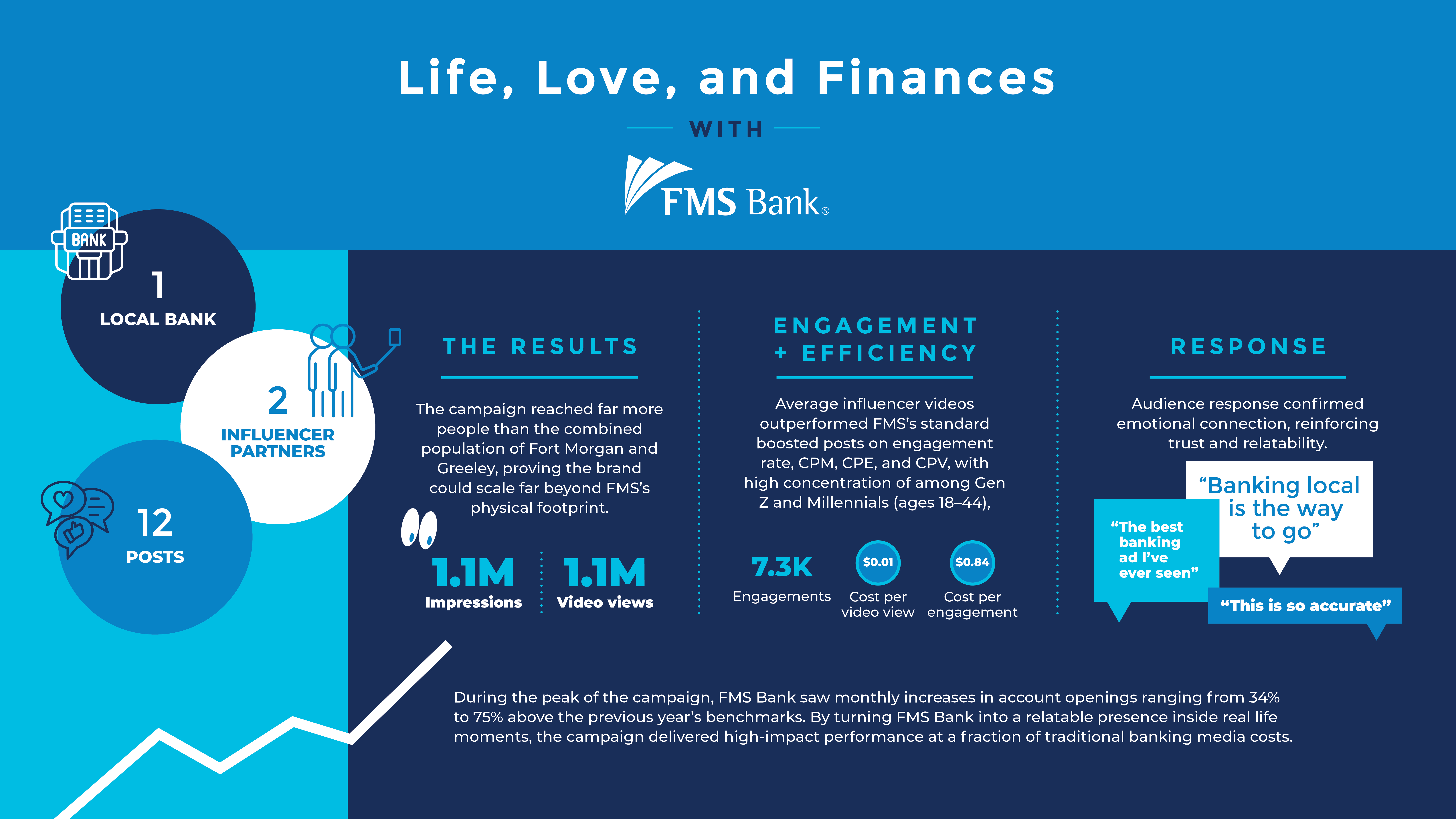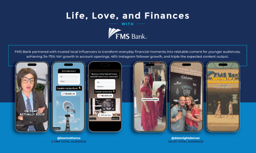 FMS Bank partnered with two Denver-based creators: Date Night Denver (142.2K followers), a micro-influencer couple sharing relatable financial moments with a tight-knit younger audience, and Pamela Maass Garrett (2.78M followers), a macro influencer and financial expert using relatable skit-style content to reach younger consumers. All content was co-concepted with each influencer to ensure authenticity and resonance.