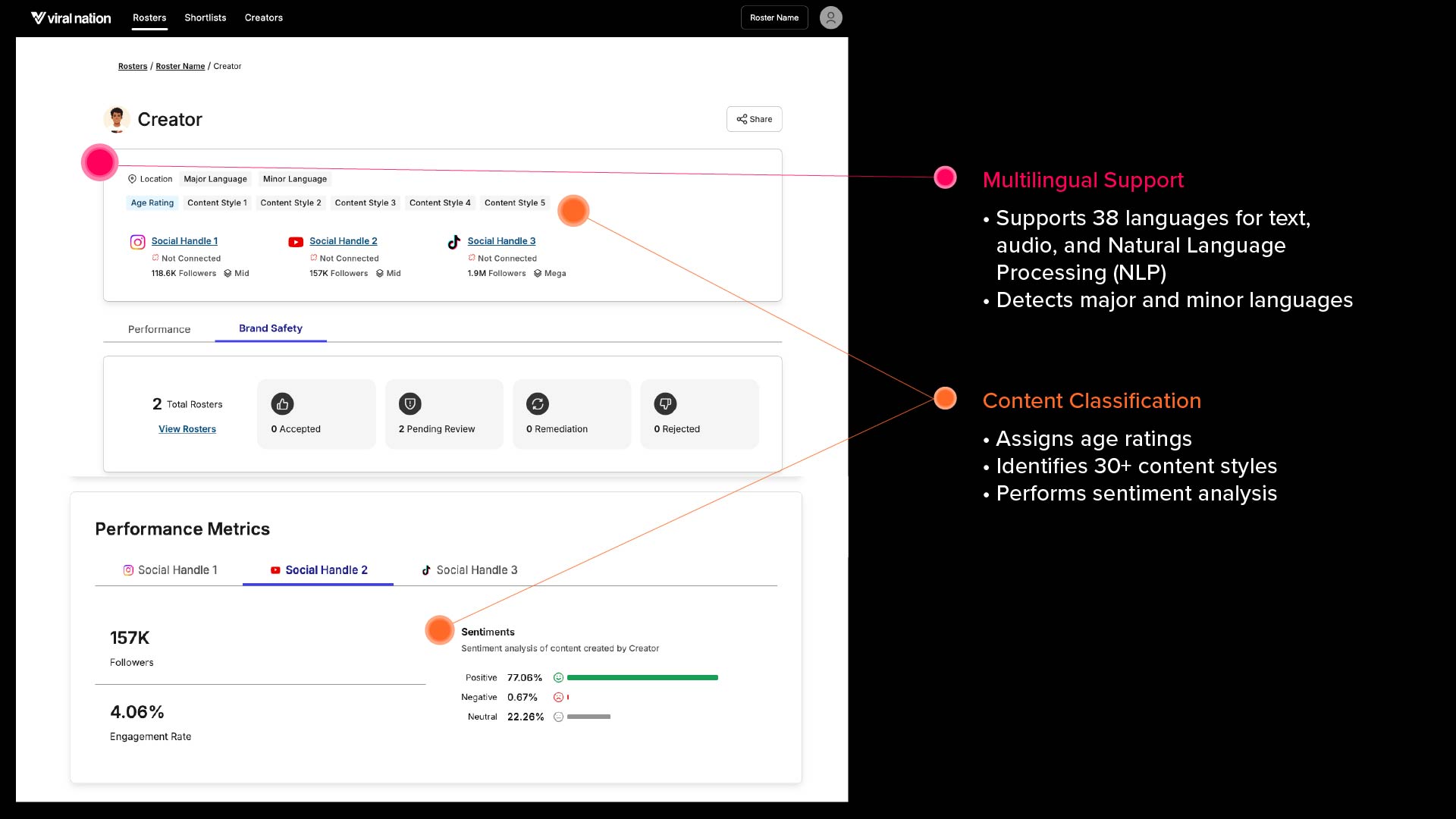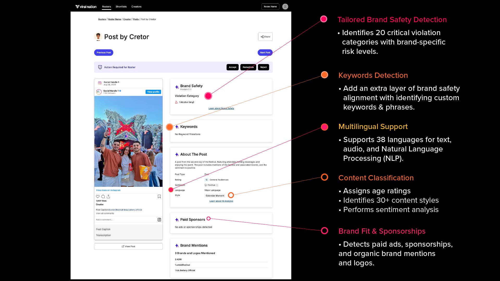 As a global authority in social-first technology, Viral Nation stands alone with the only unified tech stack that adeptly and securely caters to all requirements of social-first brand evolution. The platform has already processed over 100 years of content across video, image, text, and audio, powering smarter, safer, and faster decisions for global brands. Notable clients, including Walmart, Apple, MGM, and others, have leveraged Viral Nation Secure to streamline influencer vetting, eliminate manual processes, and reduce brand risk at scale.