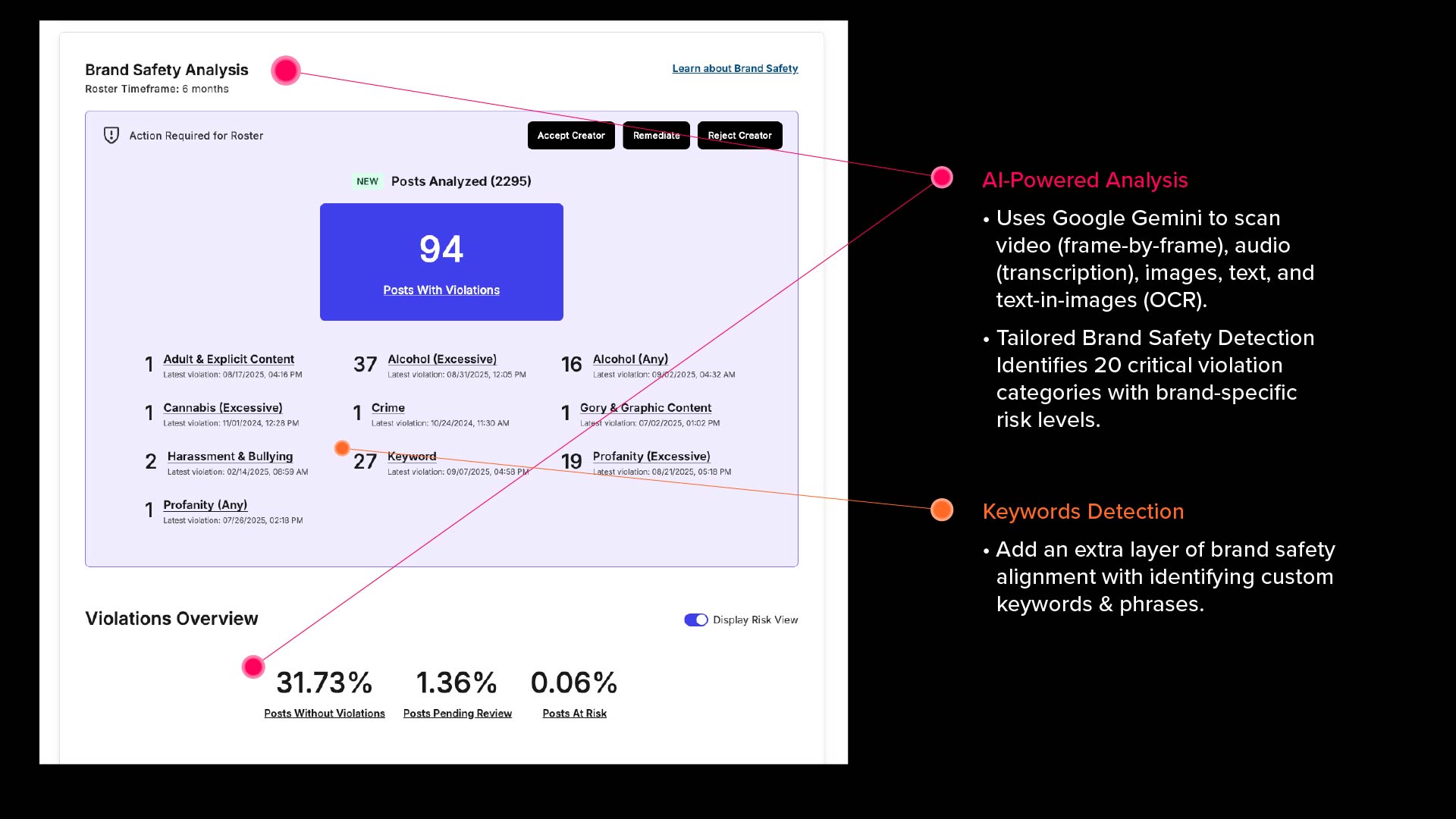 Our goal was to build a powerful AI-driven platform that can review, analyze, and identify risks across entire creator content libraries, including text, images, and video, enabling our clients to safely scale their influencer programs while saving significant time in vetting.