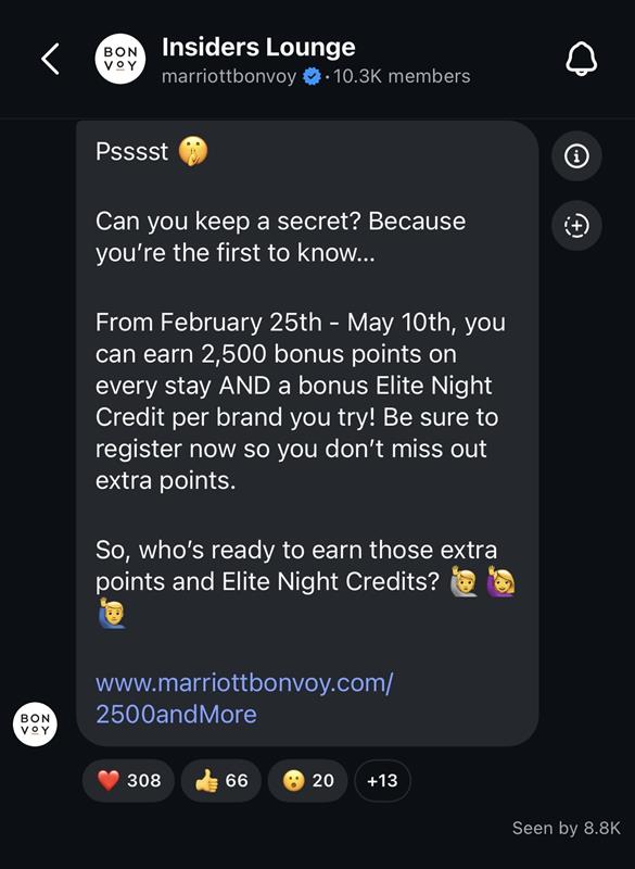 Marriott Bonvoy transformed a one‑way broadcast tool into a community‑building engine, reinforcing loyalty through relevance, access, and trust.