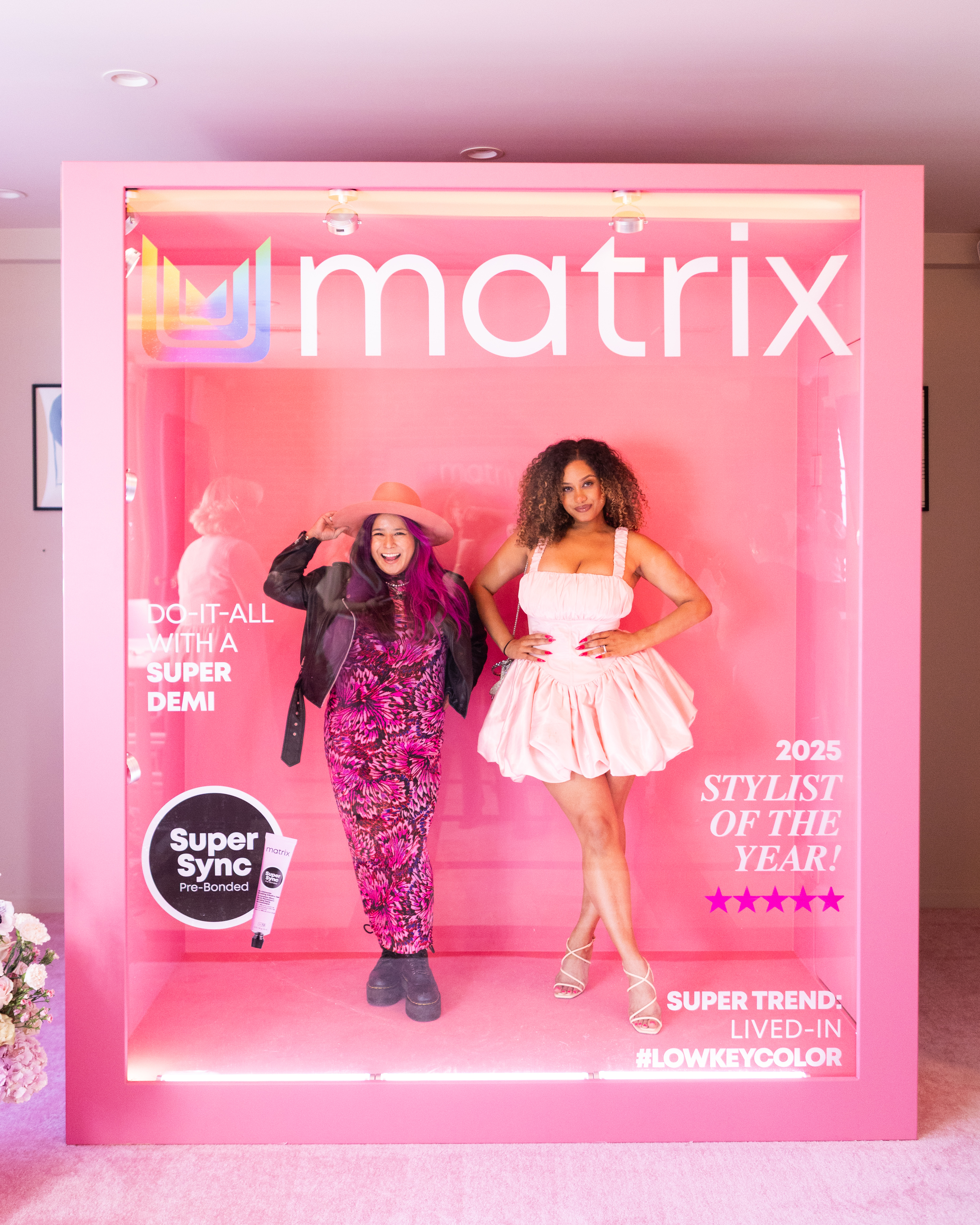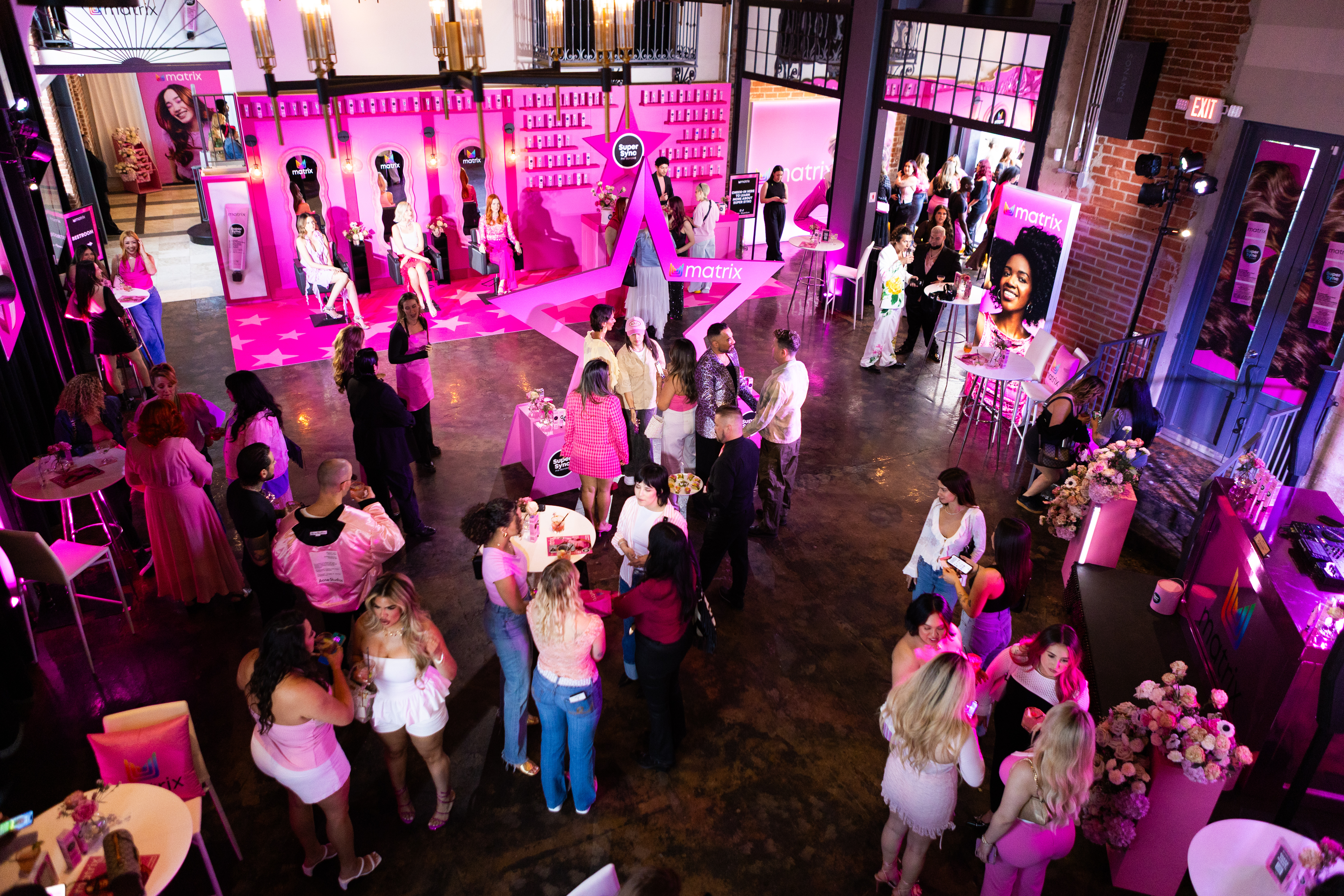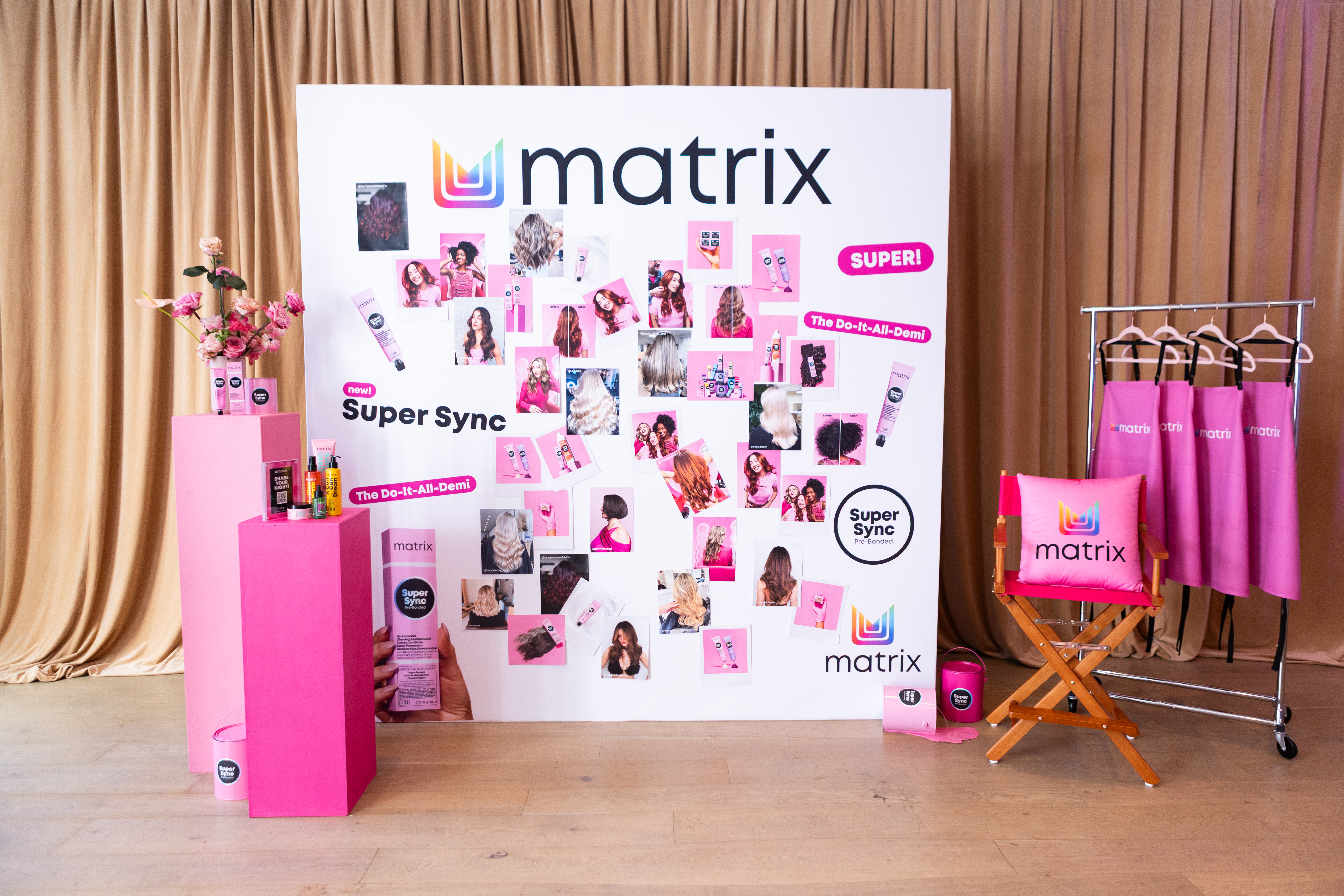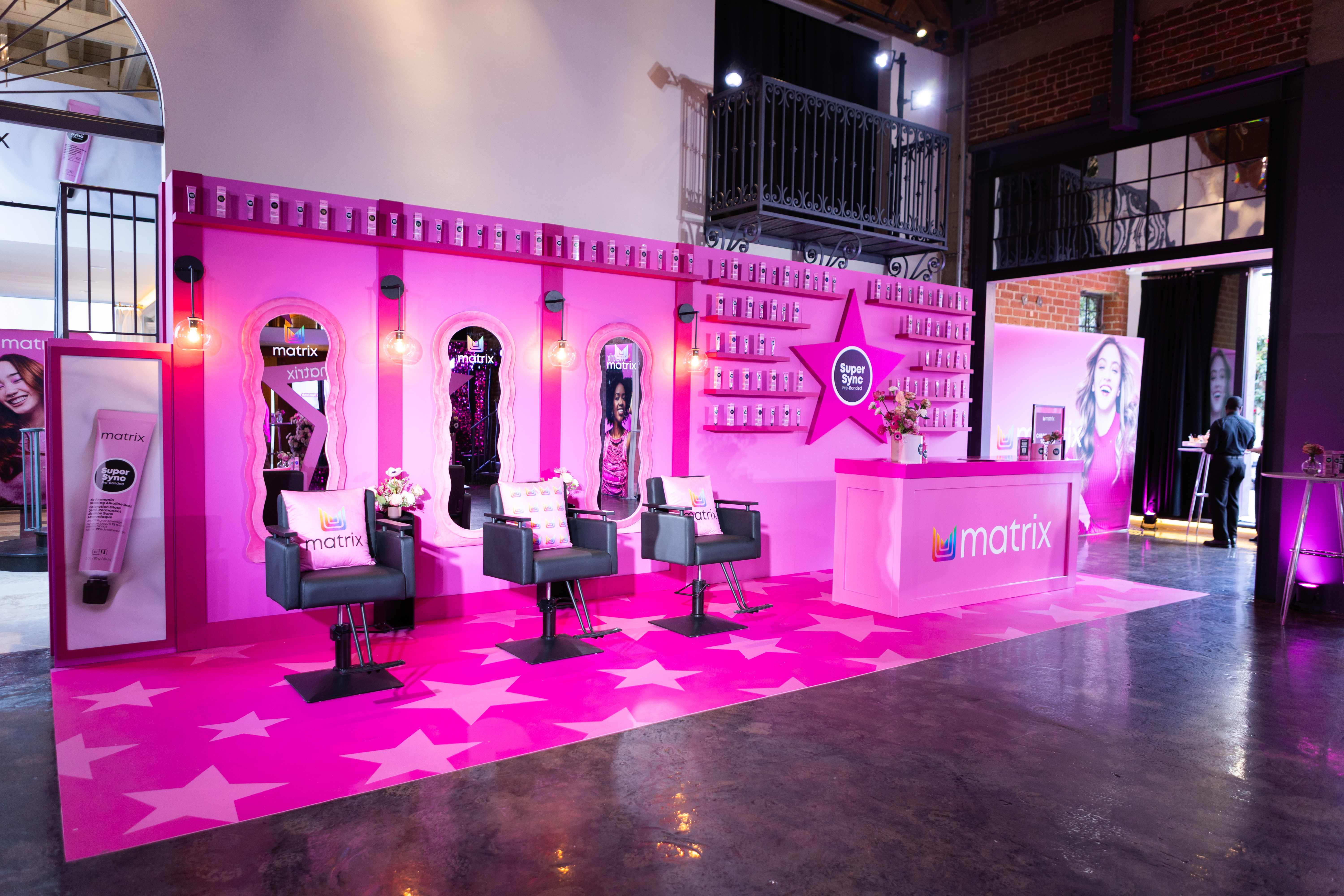 • A custom pink pop-up Matrix salon featuring live hair models in salon chairs showcasing the SuperSync shades, plus and education counter for hair pros to learn about the product