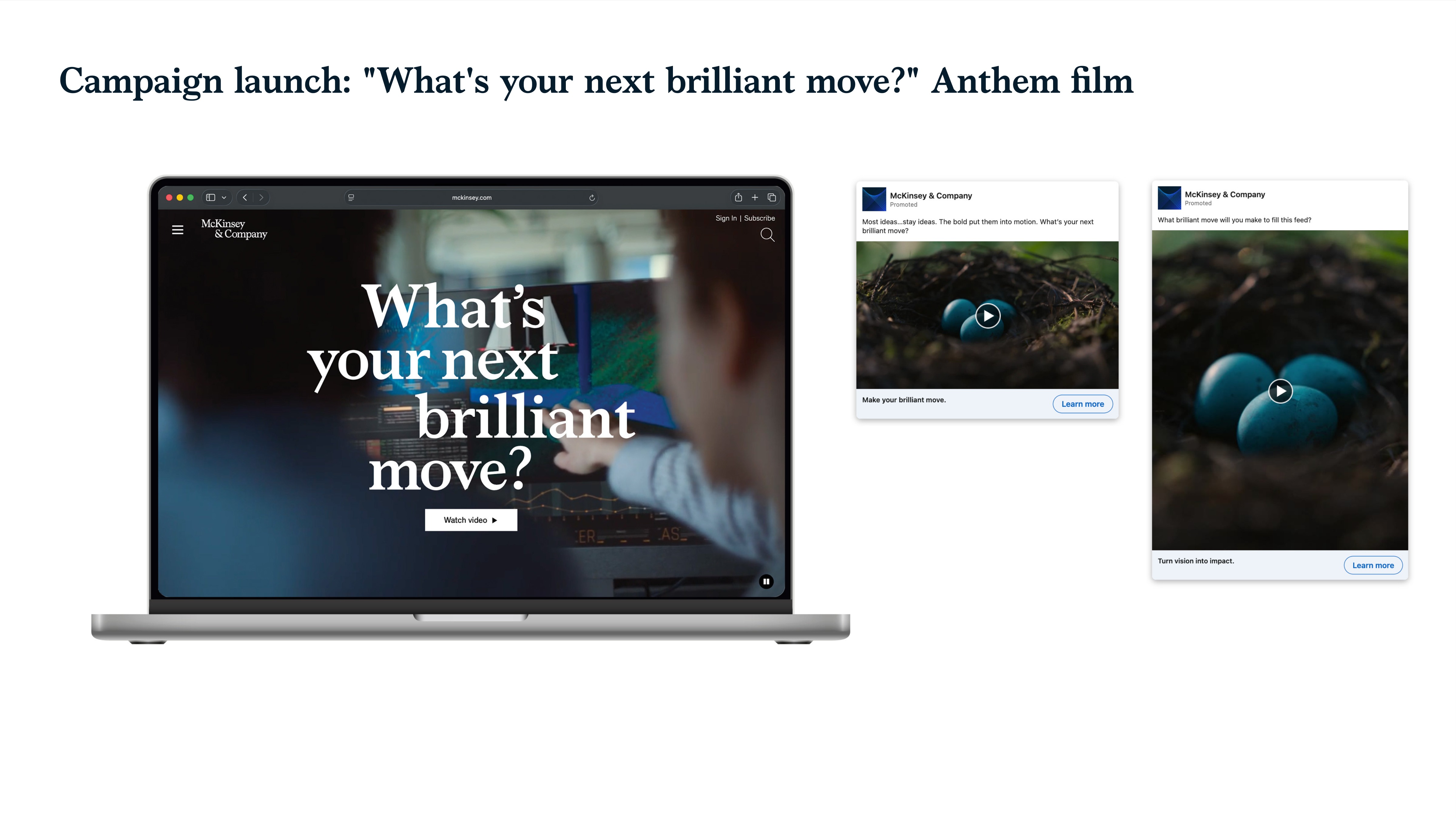 The absence of overt branding was deliberate, reinforcing credibility with senior leaders and alumni accustomed to engaging with McKinsey through trusted, one-to-one relationships. The film served as the anchor for launching paid media, premium publisher video placements, and owned channels, establishing the emotional tone for how McKinsey would show up across the broader campaign ecosystem.