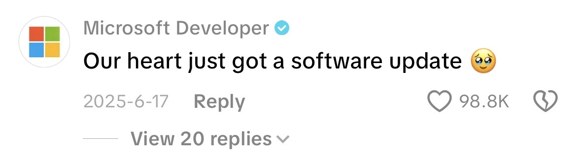 Everyday we spend hours in the comments replying to what’s popular in culture or in the dev community right now and people have noticed. Replies to our external community management like “MICROSOFT?? is that you?” or “I didn’t know Microsoft was chill like this” became common replies.