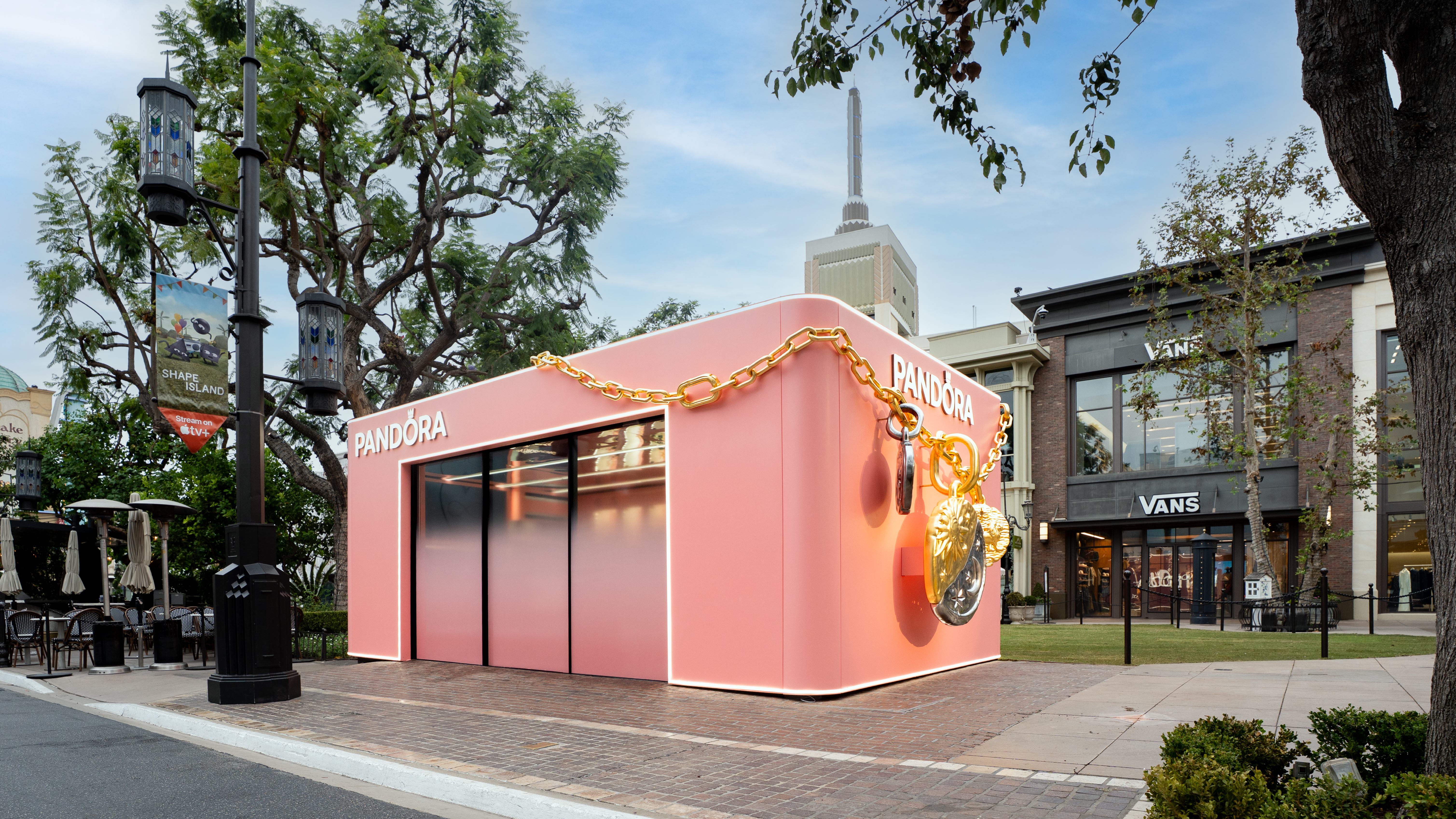 Gladiator Productions transformed The Grove’s iconic Glass Box in Los Angeles into Pandora’s Talisman Experience, a multi-sensory pop-up designed to immerse guests in the meaning and craftsmanship behind the collection. The exterior installation resembled a larger-than-life jewelry box, complete with an oversized charm bracelet featuring gold vermeil details inspired by the Talisman designs. The visual spectacle immediately signaled that this was not a standard retail footprint but a fully realized brand world.